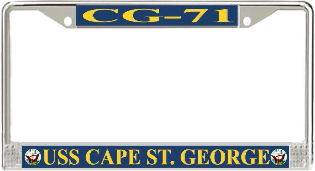 USS Cape St. George CG-71 License Plate FrameThis USS Cape St. George CG-71 License Plate Frame is proudly made in the USA at our facilities in Scottsboro, Alabama. Each of our MilitaryBest U.S. Navy Frames feature top and bottom Poly Coated Aluminum strips that are printed using sublimation which gives these quality automobile military frames a beautiful high gloss finish.