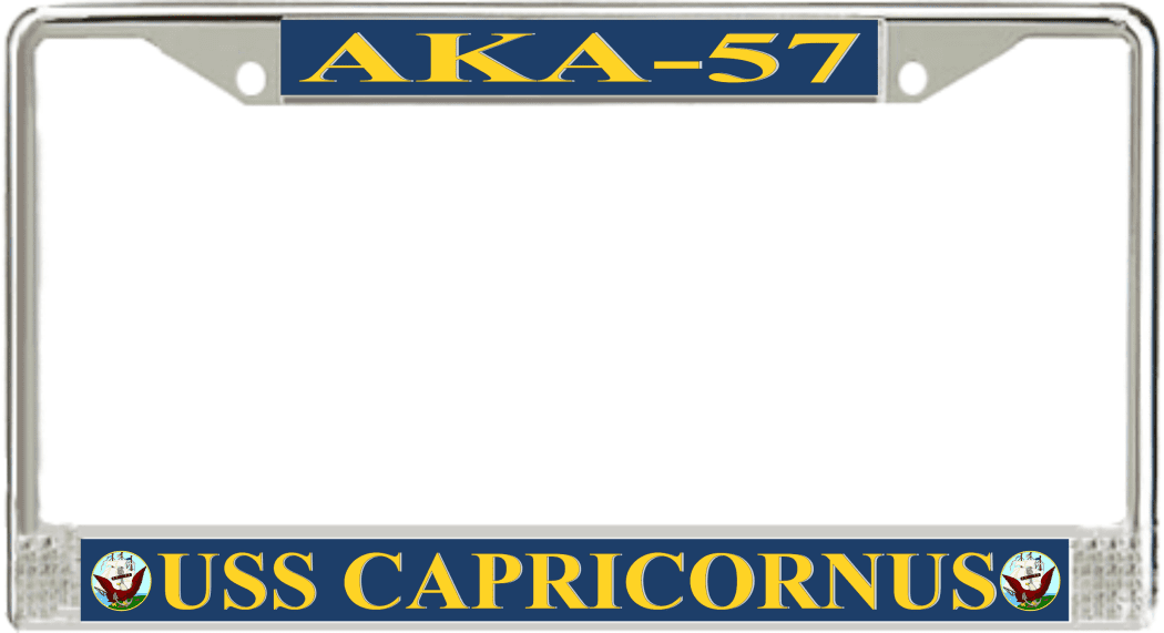 USS Capricornus AKA-57 License Plate FrameThis USS Capricornus AKA-57 License Plate Frame is proudly made in the USA at our facilities in Scottsboro, Alabama. Each of our MilitaryBest U.S. Navy Frames feature top and bottom Poly Coated Aluminum strips that are printed using sublimation which gives these quality automobile military frames a beautiful high gloss finish.