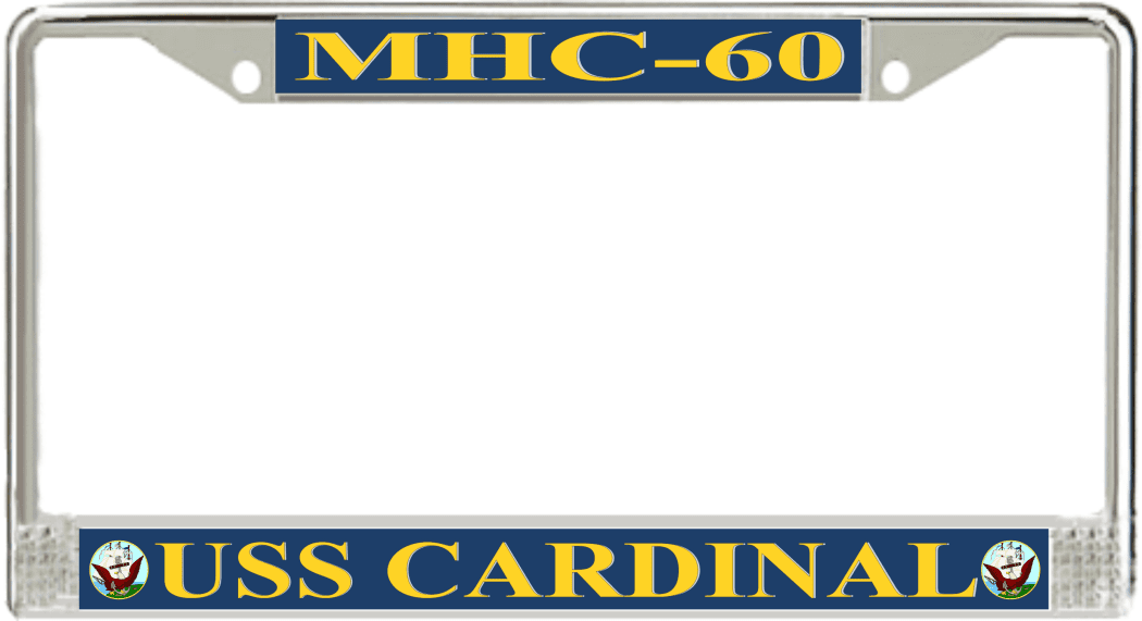 USS Cardinal MHC-60 License Plate FrameThis USS Cardinal MHC-60 License Plate Frame is proudly made in the USA at our facilities in Scottsboro, Alabama. Each of our MilitaryBest U.S. Navy Frames feature top and bottom Poly Coated Aluminum strips that are printed using sublimation which gives these quality automobile military frames a beautiful high gloss finish.