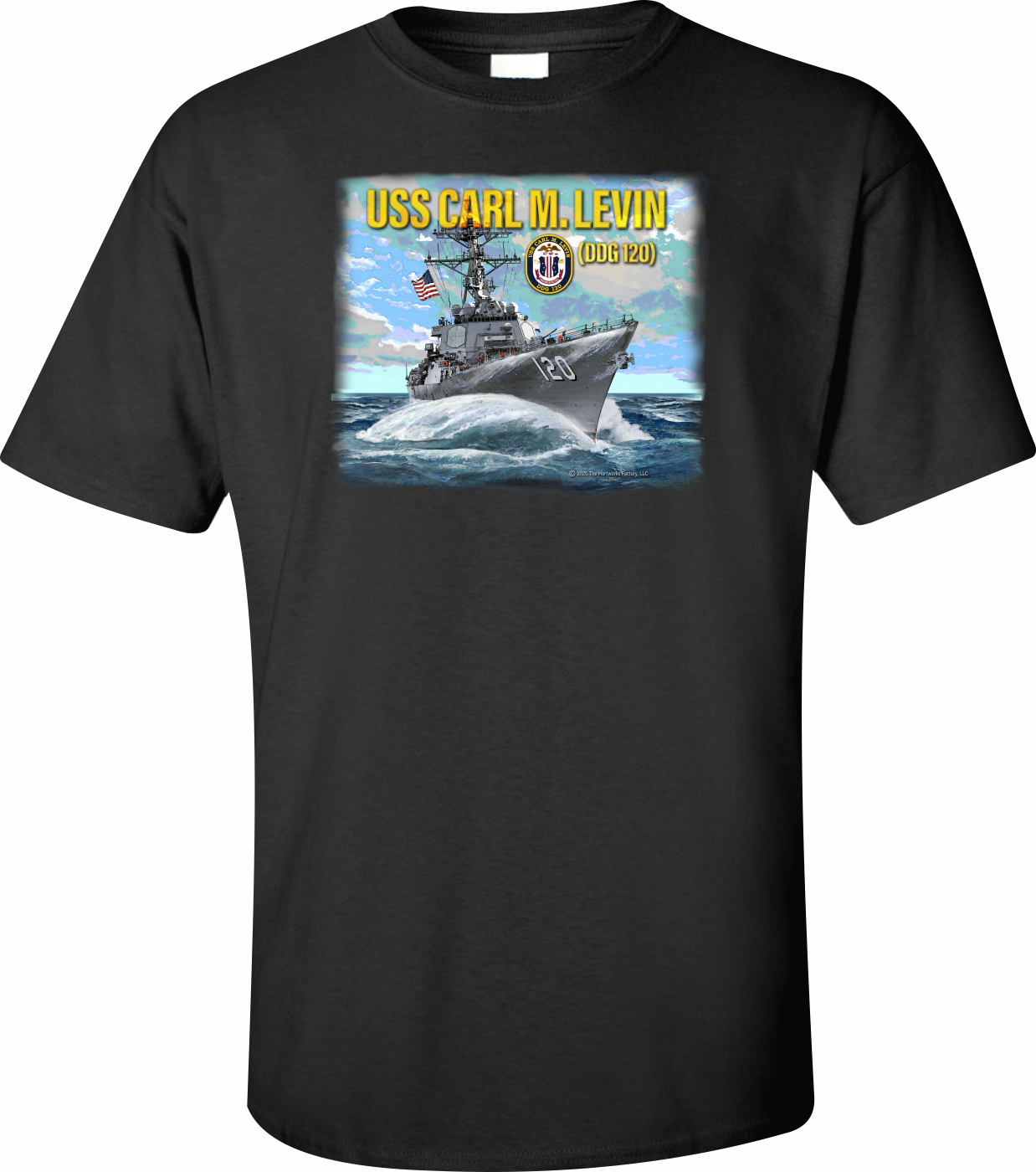 MilitaryBest is proud to offer this fine USS Carl M. Levin DDG-120 Printed Art T-Shirt. This shirt features a full front print, with beautiful artwork designed by licensed Navy artist David Hart. This shirt is available in black and navy blue colors. Each T-shirt is proudly printed in the USA.Unless there is a defect in workmanship or material, these shirts are unreturnable.