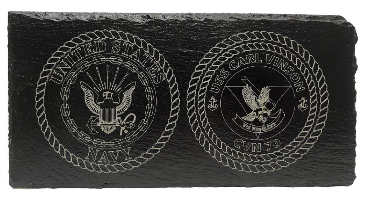 We are proud to offer this laser engraved slate plaque. This USS Carl Vinson Enlisted Plaque is engraved on a 12 x 6 inch piece of slate that offers a rustic and classic way to display on your desktop or book shelf. All plaques come with a black metal three leg stand. This plaque is Offically Licensed product by the Navy and made in the USA.