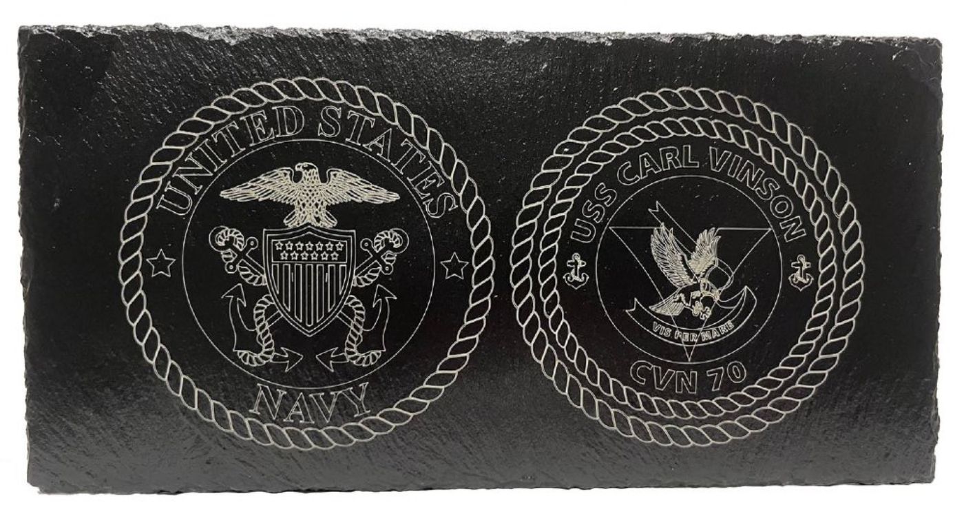 We are proud to offer this laser engraved slate plaque. This USS Carl Vinson Officer Plaque is engraved on a 12 x 6 inch piece of slate that offers a rustic and classic way to display on your desktop or book shelf. All plaques come with a black metal three leg stand. This plaque is Offically Licensed product by the Navy and made in the USA.