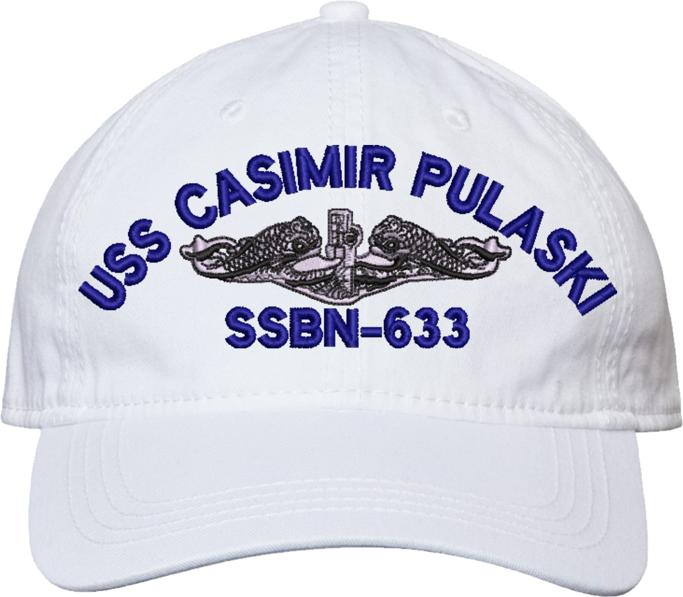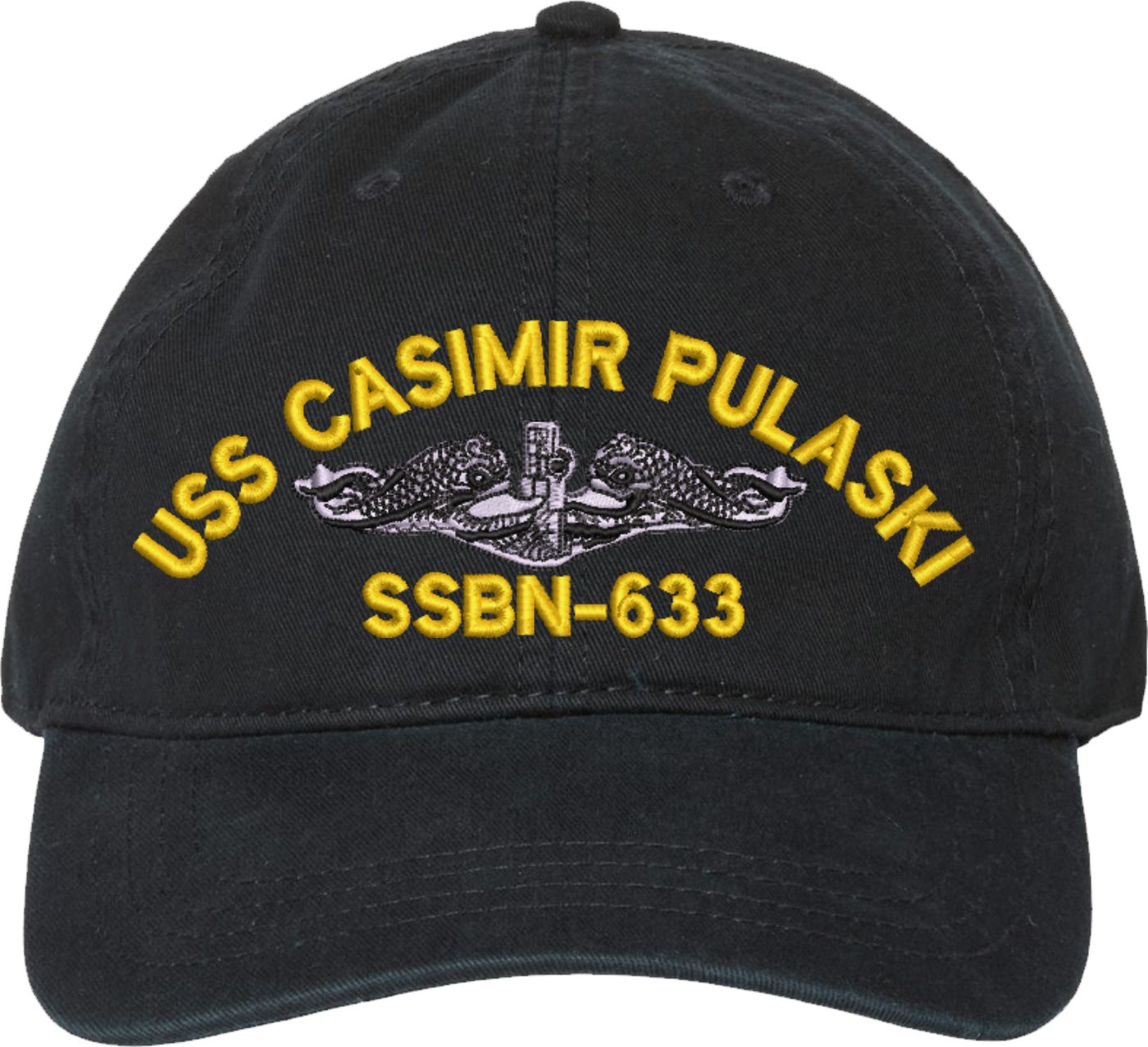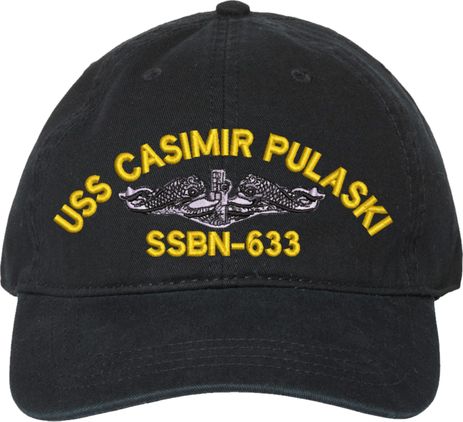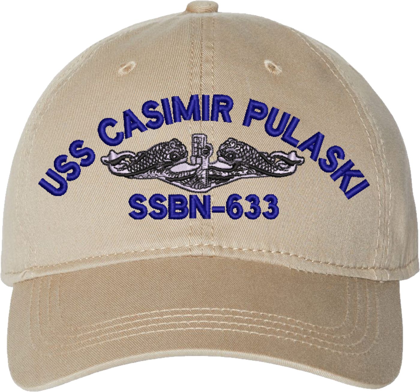 Show your Navy pride with this USS Casimir Pulaski SSBN-633 with Dolphins Unstructured Dad Cap from MilitaryBest. Crafted from 100% washed chino twill cotton, this six-panel, low-profile cap offers a relaxed and comfortable fit. Featuring high-quality embroidery done in our Scottsboro, Alabama facility, this cap is designed with a pre-curved visor and an adjustable tri-glide buckle closure for a perfect fit. Whether for everyday wear or as a meaningful gift, this cap is a great way to honor your own or a loved one's service.For caps ordered with custom embroidered personalized text please allow an additional 3 to 5 days production time. All custom back text will be embroidered in ALL CAPITAL LETTERS. Caps with back text or eggs are non-returnable unless there is a material defect in the cap.