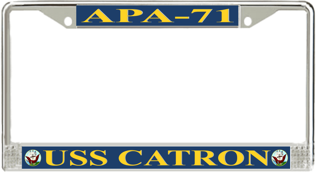USS Catron APA-71 License Plate FrameThis USS Catron APA-71 License Plate Frame is proudly made in the USA at our facilities in Scottsboro, Alabama. Each of our MilitaryBest U.S. Navy Frames feature top and bottom Poly Coated Aluminum strips that are printed using sublimation which gives these quality automobile military frames a beautiful high gloss finish.