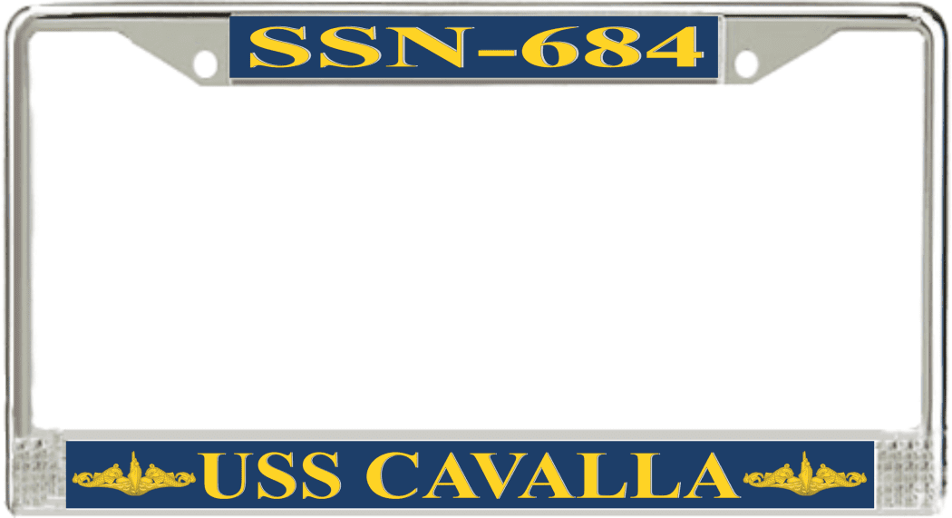 USS Cavalla SSN-684 License Plate Frame This USS Cavalla SSN-684 License Plate Frame is proudly made in the USA at our facilities in Scottsboro, Alabama. Each Frame features top and bottom sublimated design strips that are poly coated for a protective gloss finish. Please check your state and local regulations for compatibility of these frames for use on your vehicle.