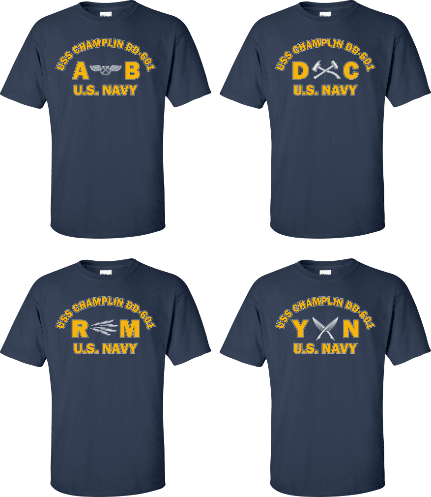 Due to disruptions in supply chains, this design will be embroidered on a Champion, Gildan, Jerzees or comparable brand.Proudly display your ship and rate with our top quality USS CHAMPLIN DD-601 Rates t-shirts, sweatshirts, and hoodies. These fine U.S. Navy apparel items will make you the envy of your veteran buddies, or will make a fine gift! Our USS CHAMPLIN DD-601 shirts are proudly printed in the USA!