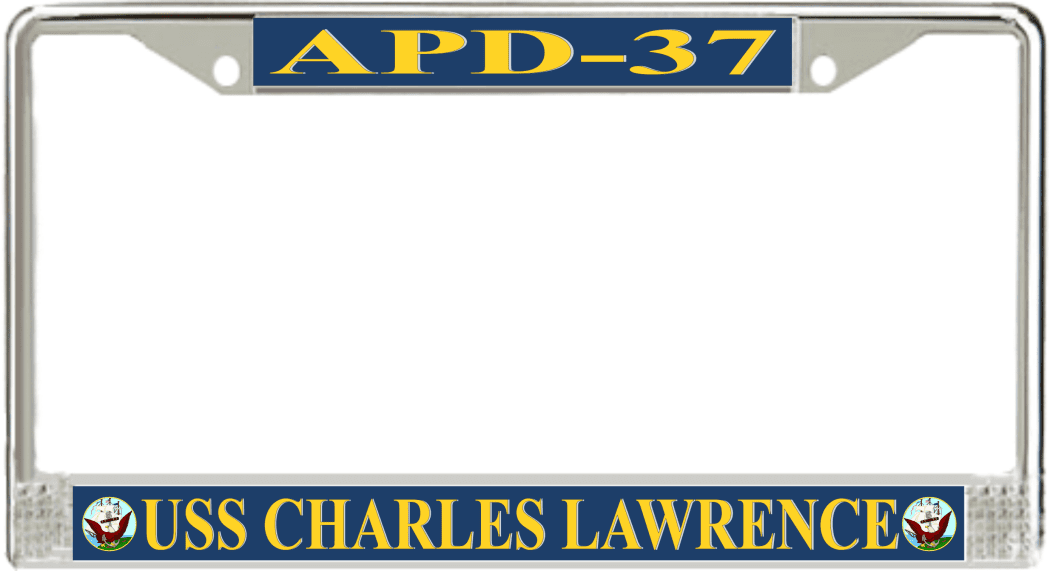 USS Charles Lawrence APD-37 License Plate FrameThis USS Charles Lawrence APD-37 License Plate Frame is proudly made in the USA at our facilities in Scottsboro, Alabama. Each of our MilitaryBest U.S. Navy Frames feature top and bottom Poly Coated Aluminum strips that are printed using sublimation which gives these quality automobile military frames a beautiful high gloss finish.