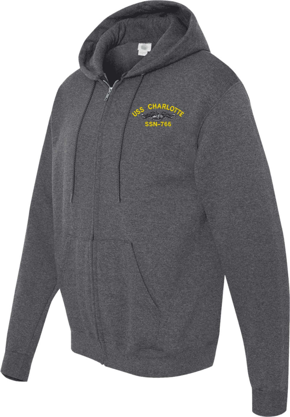 MilitaryBest has expanded its line of apparel with this custom embroidered USS Charlotte SSN-766 with Dolphins Embroidered Zippered Hoodie. Each Hoodie is direct embroidered onto a Champion brand 9.5 oz 50/50 Cotton Poly blend. This will make an excellent addition to your wardrobe, or a great gift. Your satisfaction is Guaranteed! These quality zippered hoodies are proudly embroidered at our facilities in Scottsboro, AL. Support the Army MWR program by purchasing only from Licensed Vendors.