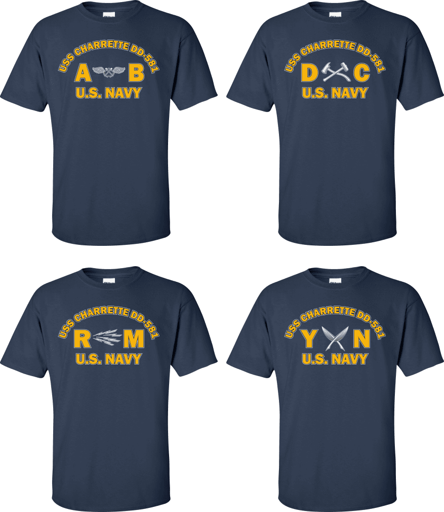 Due to disruptions in supply chains, this design will be embroidered on a Champion, Gildan, Jerzees or comparable brand.Proudly display your ship and rate with our top quality USS CHARRETTE DD-581 Rates t-shirts, sweatshirts, and hoodies. These fine U.S. Navy apparel items will make you the envy of your veteran buddies, or will make a fine gift! Our USS CHARRETTE DD-581 shirts are proudly printed in the USA!