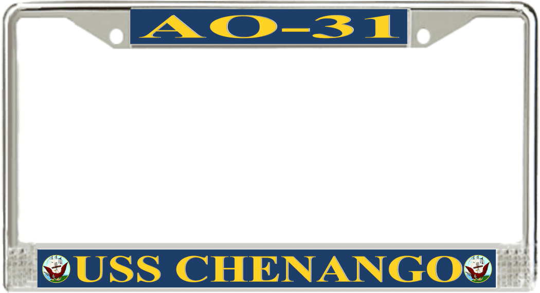 USS Chenango AO-31 License Plate FrameThis USS Chenango AO-31 License Plate Frame is proudly made in the USA at our facilities in Scottsboro, Alabama. Each of our MilitaryBest U.S. Navy Frames feature top and bottom Poly Coated Aluminum strips that are printed using sublimation which gives these quality automobile military frames a beautiful high gloss finish.