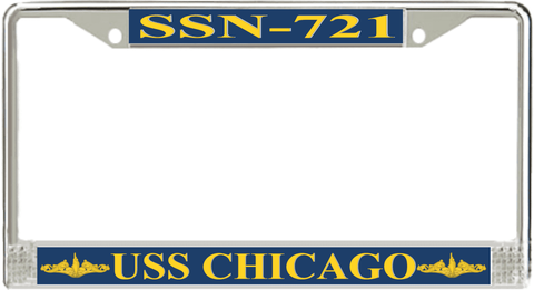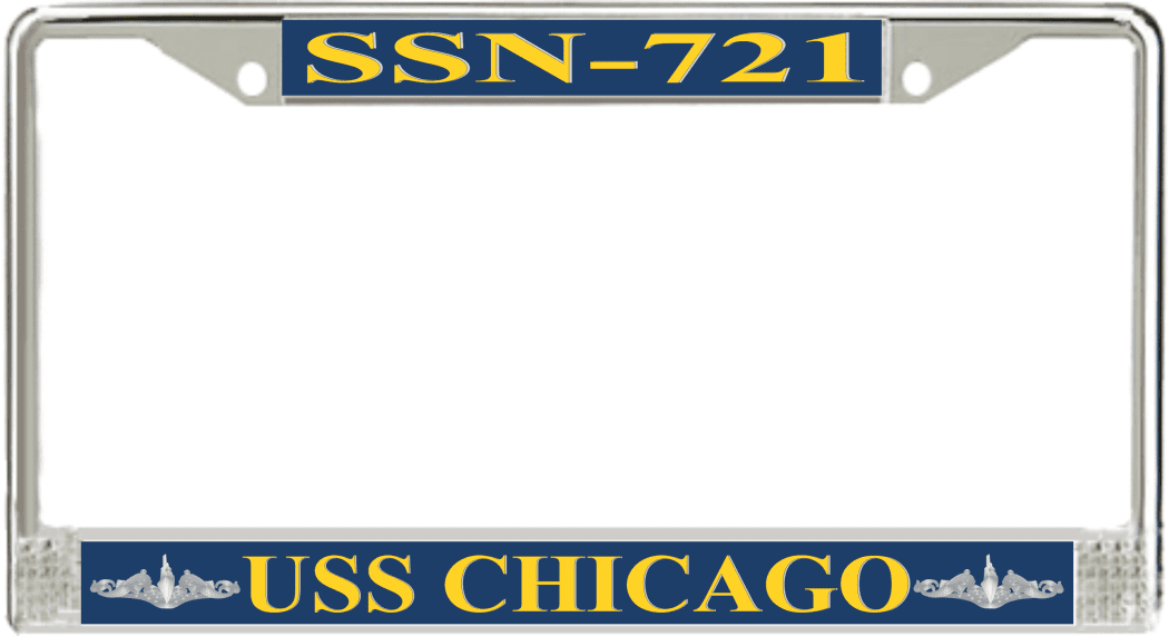 USS Chicago SSN-721 License Plate Frame This USS Chicago SSN-721 License Plate Frame is proudly made in the USA at our facilities in Scottsboro, Alabama. Each Frame features top and bottom sublimated design strips that are poly coated for a protective gloss finish. Please check your state and local regulations for compatibility of these frames for use on your vehicle.