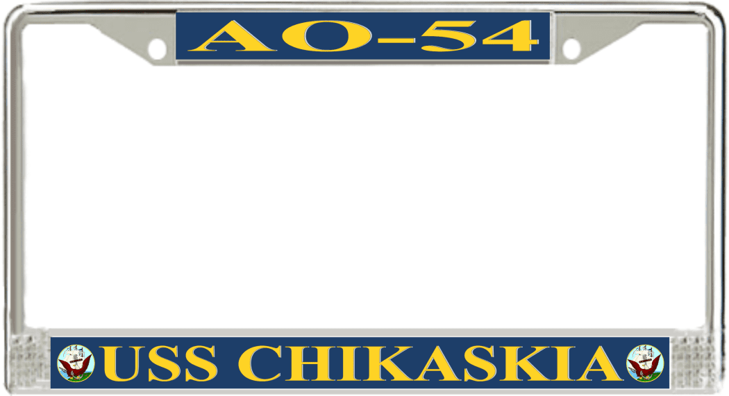 USS Chikaskia AO-54 License Plate FrameThis USS Chikaskia AO-54 License Plate Frame is proudly made in the USA at our facilities in Scottsboro, Alabama. Each of our MilitaryBest U.S. Navy Frames feature top and bottom Poly Coated Aluminum strips that are printed using sublimation which gives these quality automobile military frames a beautiful high gloss finish.