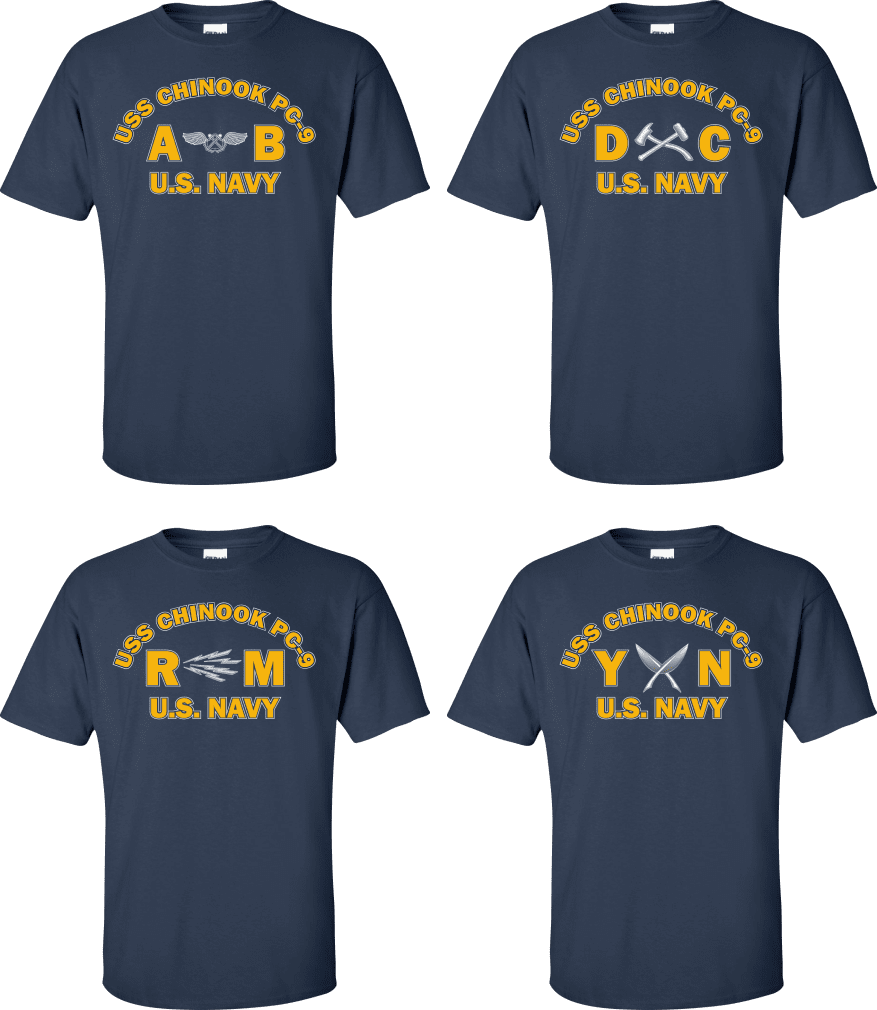 Due to disruptions in supply chains, this design will be embroidered on a Champion, Gildan, Jerzees or comparable brand.Proudly display your ship and rate with our top quality USS CHINOOK PC-9 Rates t-shirts, sweatshirts, and hoodies. These fine U.S. Navy apparel items will make you the envy of your veteran buddies, or will make a fine gift! Our USS CHINOOK PC-9 shirts are proudly printed in the USA!