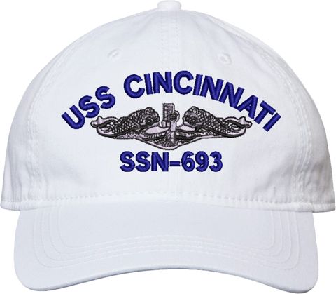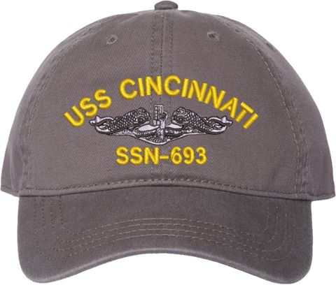 Show your Navy pride with this USS Cincinnati SSN-693 with Dolphins Unstructured Dad Cap from MilitaryBest. Crafted from 100% washed chino twill cotton, this six-panel, low-profile cap offers a relaxed and comfortable fit. Featuring high-quality embroidery done in our Scottsboro, Alabama facility, this cap is designed with a pre-curved visor and an adjustable tri-glide buckle closure for a perfect fit. Whether for everyday wear or as a meaningful gift, this cap is a great way to honor your own or a loved one's service.For caps ordered with custom embroidered personalized text please allow an additional 3 to 5 days production time. All custom back text will be embroidered in ALL CAPITAL LETTERS. Caps with back text or eggs are non-returnable unless there is a material defect in the cap.