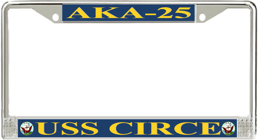 USS Circe AKA-25 License Plate FrameThis USS Circe AKA-25 License Plate Frame is proudly made in the USA at our facilities in Scottsboro, Alabama. Each of our MilitaryBest U.S. Navy Frames feature top and bottom Poly Coated Aluminum strips that are printed using sublimation which gives these quality automobile military frames a beautiful high gloss finish.