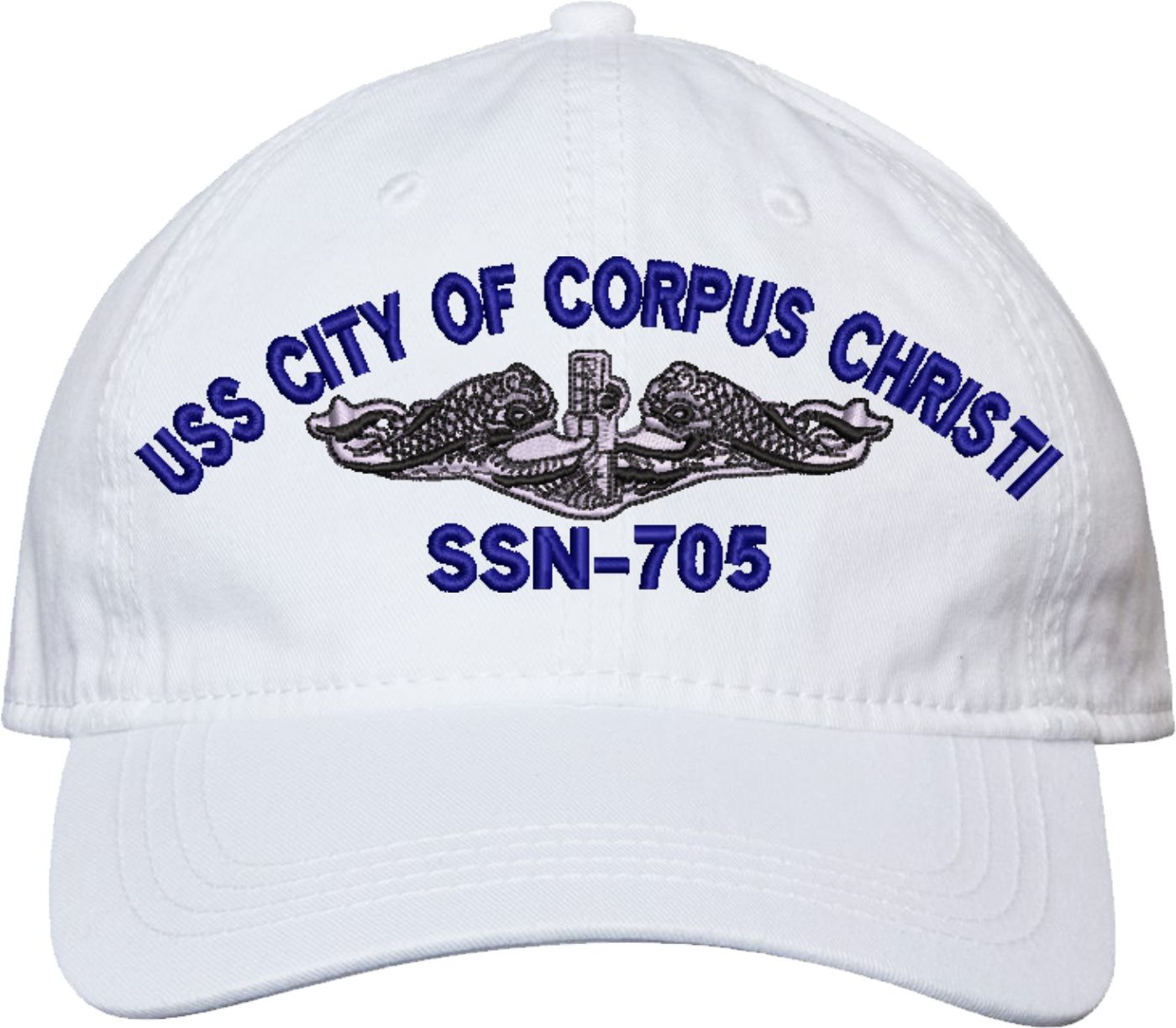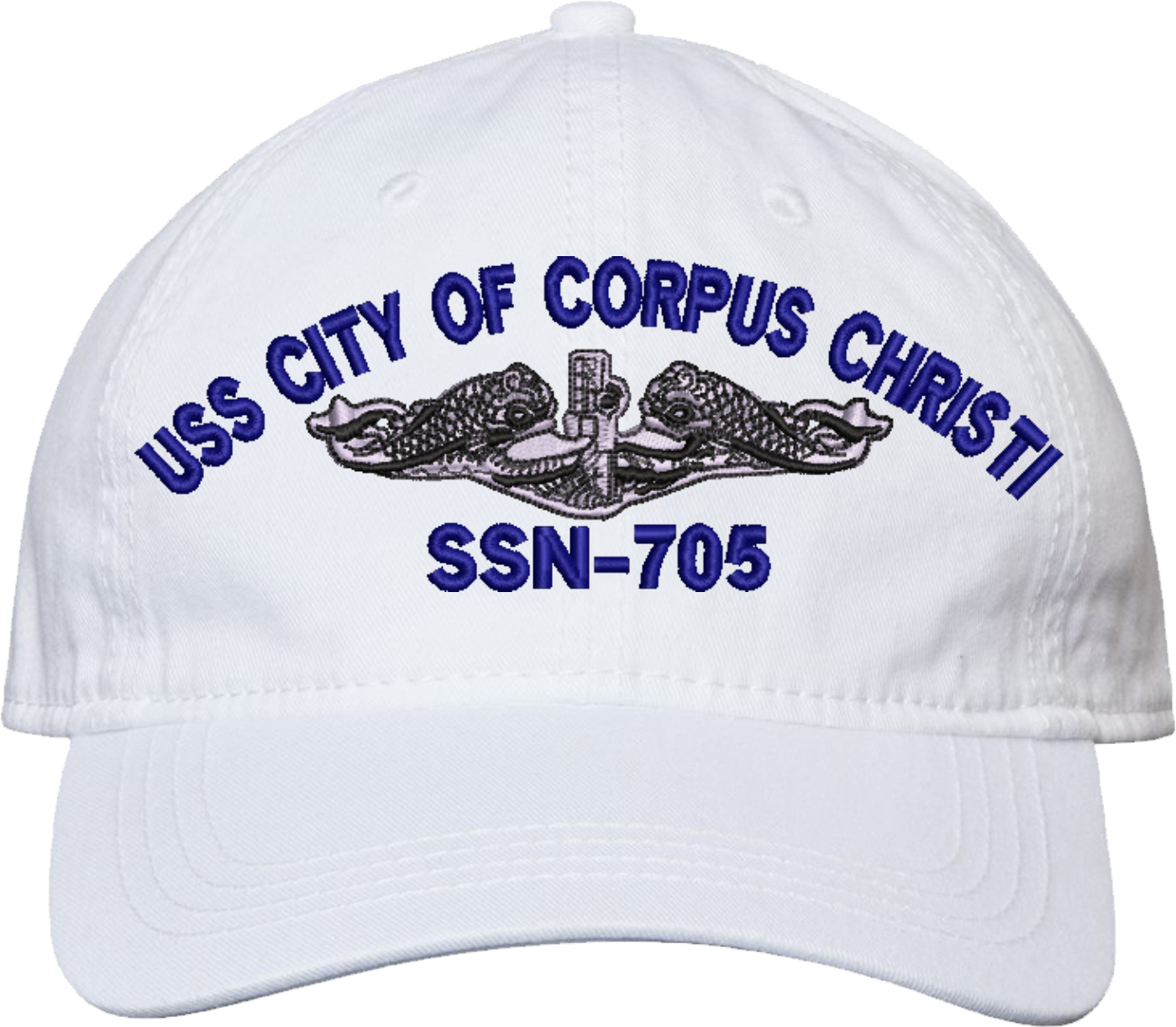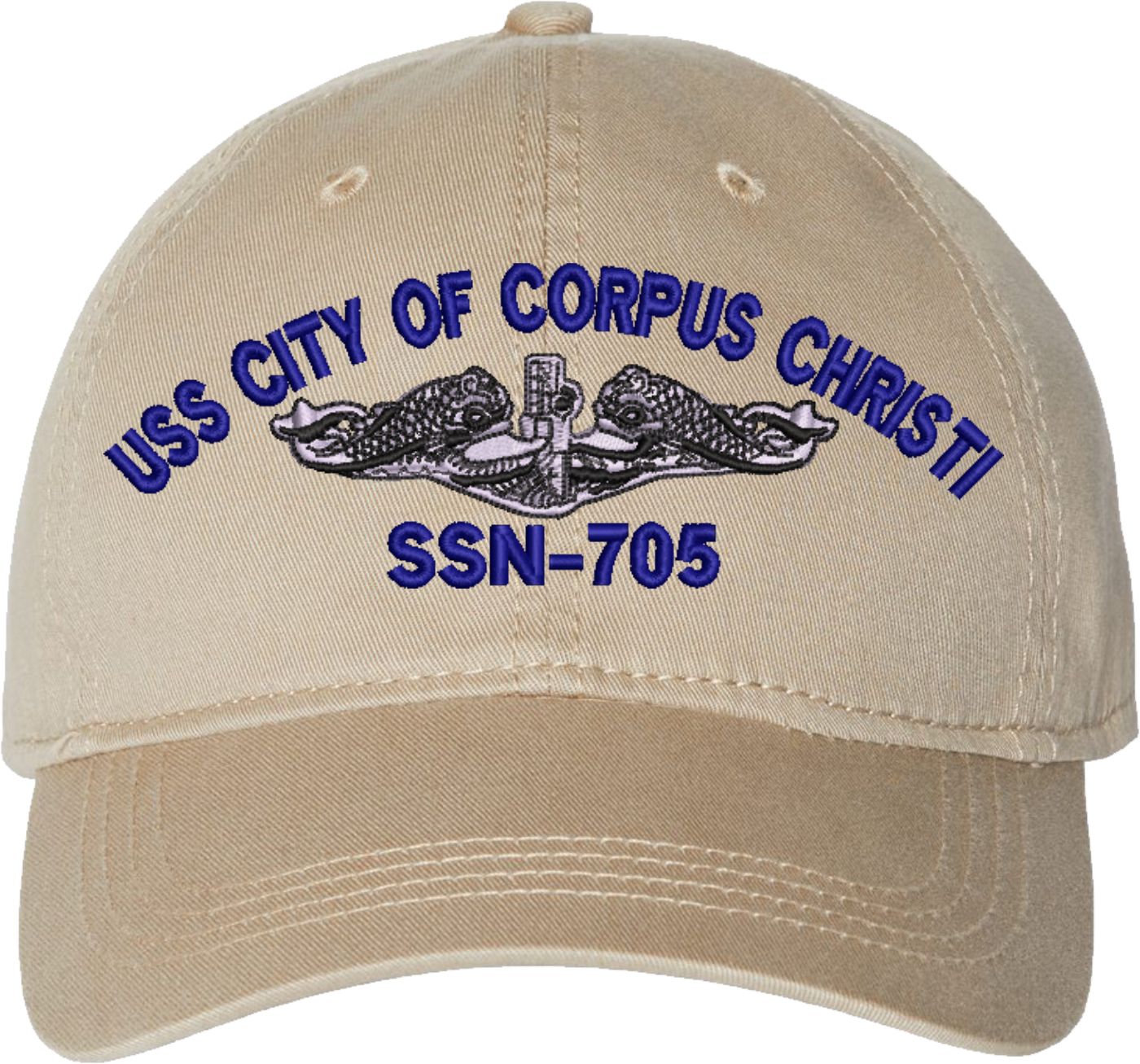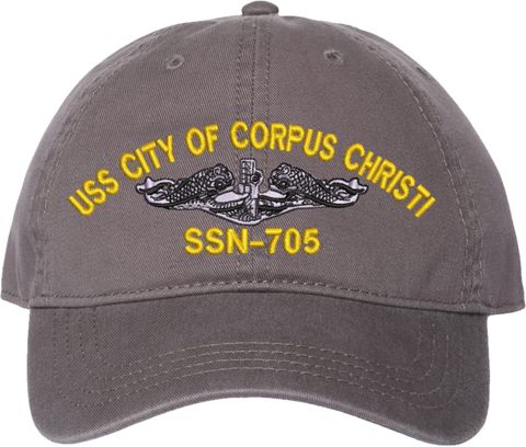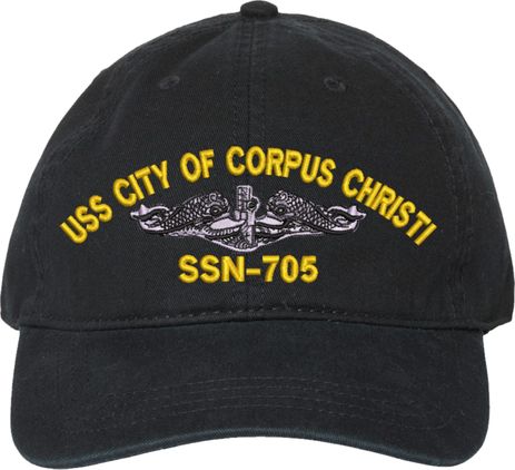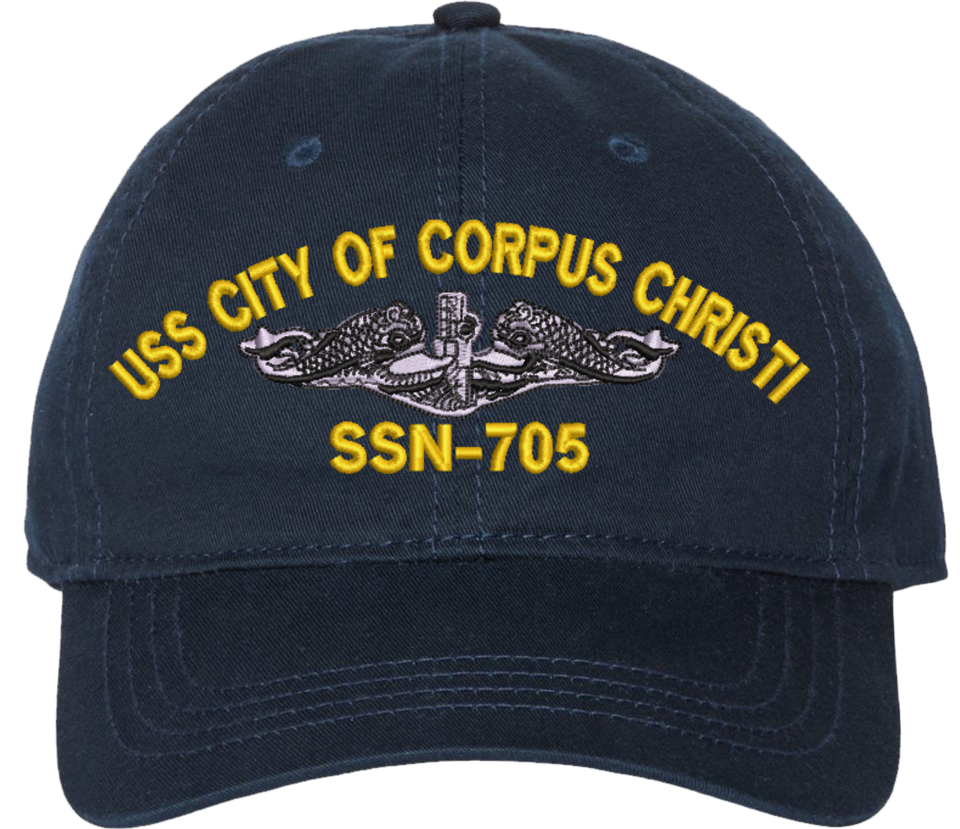 Show your Navy pride with this USS City Of Corpus Christi SSN-705 with Dolphins Unstructured Dad Cap from MilitaryBest. Crafted from 100% washed chino twill cotton, this six-panel, low-profile cap offers a relaxed and comfortable fit. Featuring high-quality embroidery done in our Scottsboro, Alabama facility, this cap is designed with a pre-curved visor and an adjustable tri-glide buckle closure for a perfect fit. Whether for everyday wear or as a meaningful gift, this cap is a great way to honor your own or a loved one's service.For caps ordered with custom embroidered personalized text please allow an additional 3 to 5 days production time. All custom back text will be embroidered in ALL CAPITAL LETTERS. Caps with back text or eggs are non-returnable unless there is a material defect in the cap.