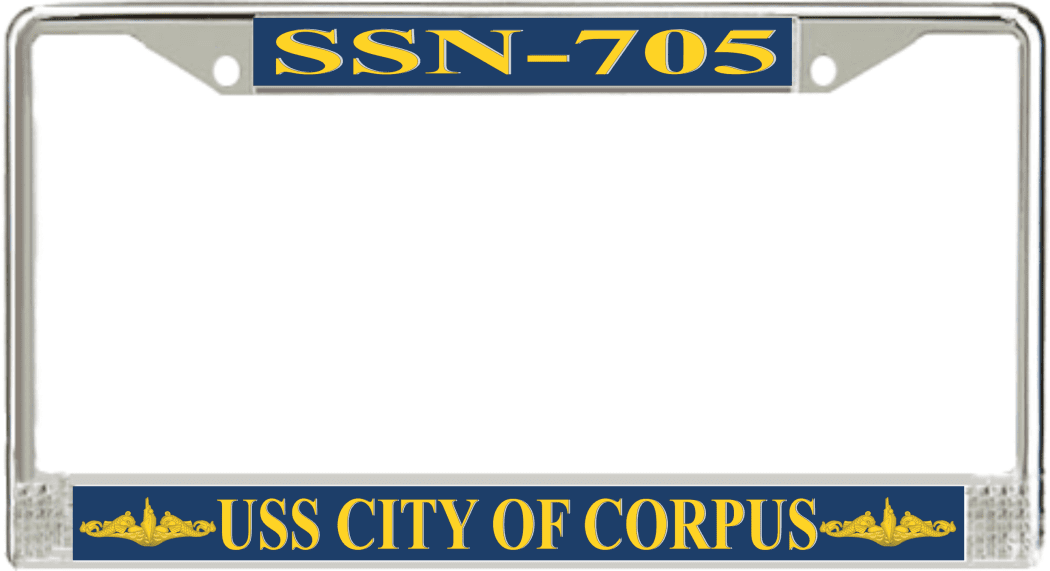 USS City of Corpus SSN-705 License Plate Frame This USS City of Corpus SSN-705 License Plate Frame is proudly made in the USA at our facilities in Scottsboro, Alabama. Each Frame features top and bottom sublimated design strips that are poly coated for a protective gloss finish. Please check your state and local regulations for compatibility of these frames for use on your vehicle.