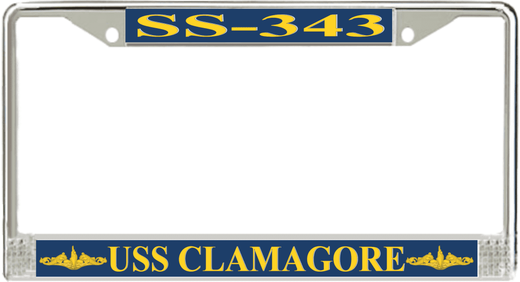 USS Clamagore SS-343 License Plate Frame This USS Clamagore SS-343 License Plate Frame is proudly made in the USA at our facilities in Scottsboro, Alabama. Each Frame features top and bottom sublimated design strips that are poly coated for a protective gloss finish. Please check your state and local regulations for compatibility of these frames for use on your vehicle.