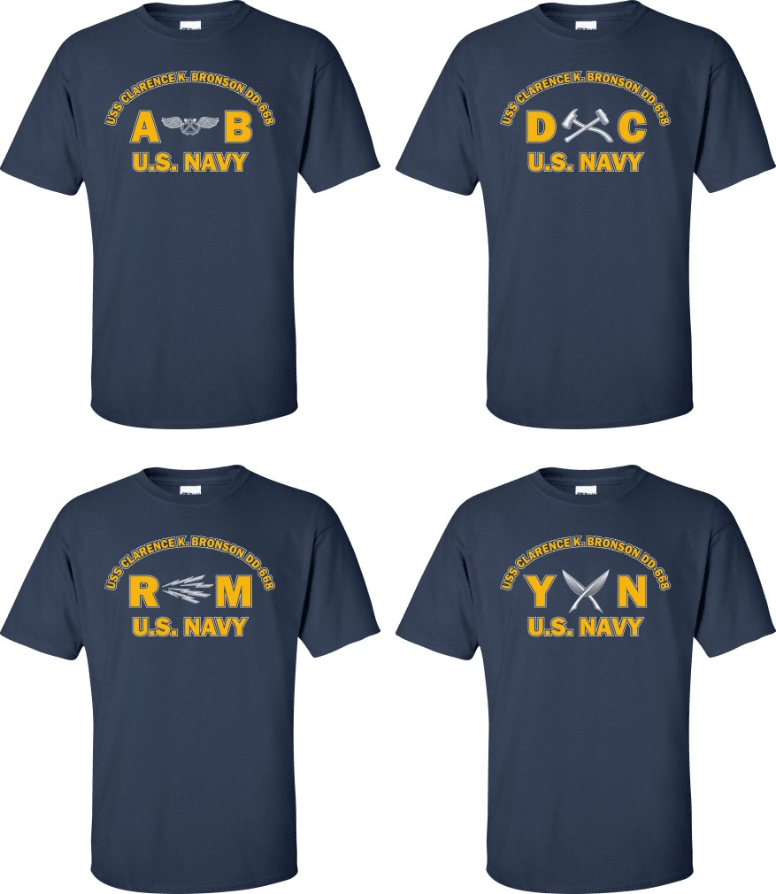 Due to disruptions in supply chains, this design will be embroidered on a Champion, Gildan, Jerzees or comparable brand.Proudly display your ship and rate with our top quality USS CLARENCE K. BRONSON DD-668 Rates t-shirts, sweatshirts, and hoodies. These fine U.S. Navy apparel items will make you the envy of your veteran buddies, or will make a fine gift! Our USS CLARENCE K. BRONSON DD-668 shirts are proudly printed in the USA!