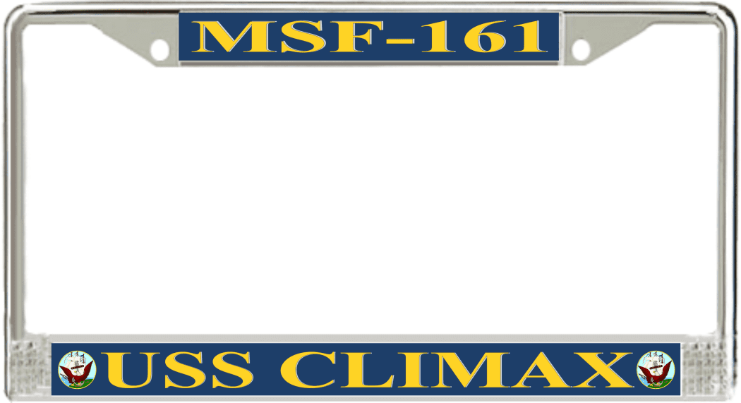 USS Climax MSF-161 License Plate FrameThis USS Climax MSF-161 License Plate Frame is proudly made in the USA at our facilities in Scottsboro, Alabama. Each of our MilitaryBest U.S. Navy Frames feature top and bottom Poly Coated Aluminum strips that are printed using sublimation which gives these quality automobile military frames a beautiful high gloss finish.