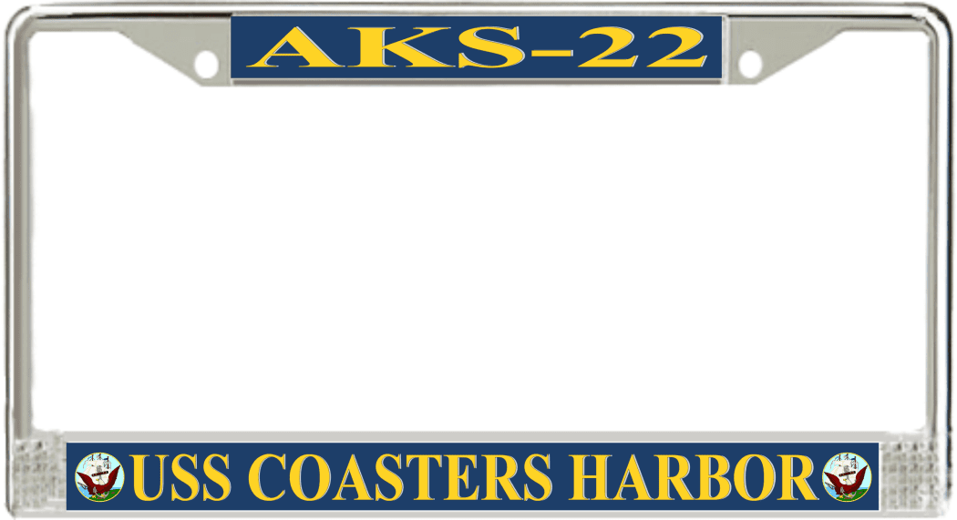 USS Coasters Harbor AKS-22 License Plate FrameThis USS Coasters Harbor AKS-22 License Plate Frame is proudly made in the USA at our facilities in Scottsboro, Alabama. Each of our MilitaryBest U.S. Navy Frames feature top and bottom Poly Coated Aluminum strips that are printed using sublimation which gives these quality automobile military frames a beautiful high gloss finish.