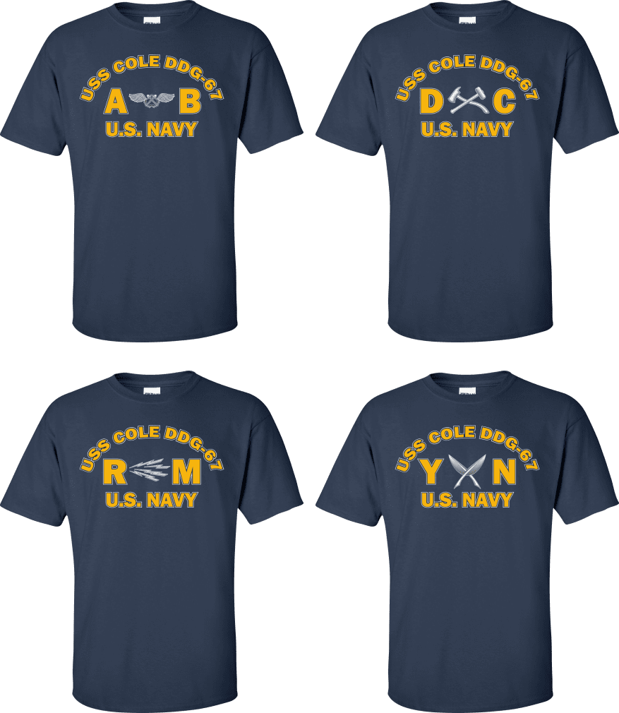 Due to disruptions in supply chains, this design will be embroidered on a Champion, Gildan, Jerzees or comparable brand.Proudly display your ship and rate with our top quality USS COLE DDG-67 Rates t-shirts, sweatshirts, and hoodies. These fine U.S. Navy apparel items will make you the envy of your veteran buddies, or will make a fine gift! Our USS COLE DDG-67 shirts are proudly printed in the USA!