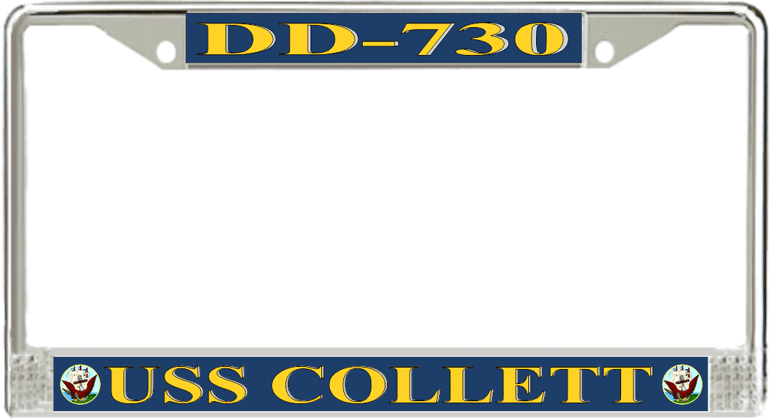 USS Collett DD-730 License Plate FrameThis USS Collett DD-730 License Plate Frame is proudly made in the USA at our facilities in Scottsboro, Alabama. Each of our MilitaryBest U.S. Navy Frames feature top and bottom Poly Coated Aluminum strips that are printed using sublimation which gives these quality automobile military frames a beautiful high gloss finish.