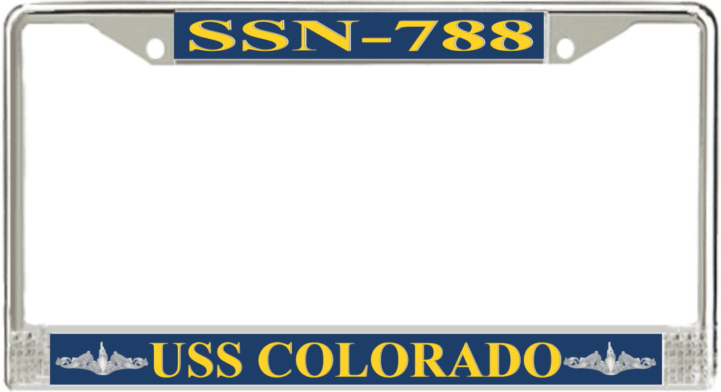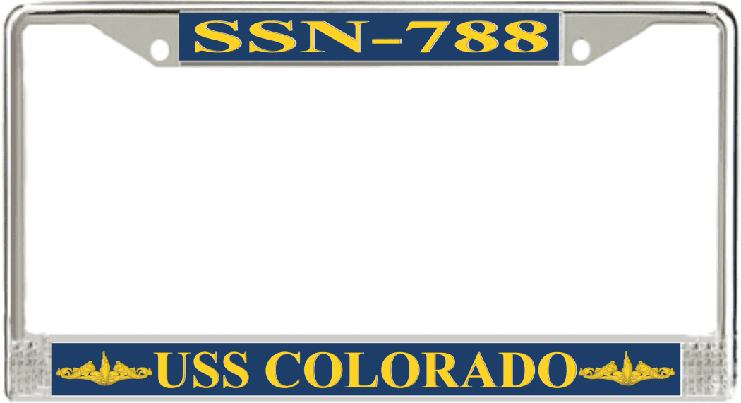 USS Colorado SSN-788 License Plate Frame This USS Colorado SSN-788 License Plate Frame is proudly made in the USA at our facilities in Scottsboro, Alabama. Each Frame features top and bottom sublimated design strips that are poly coated for a protective gloss finish. Please check your state and local regulations for compatibility of these frames for use on your vehicle.