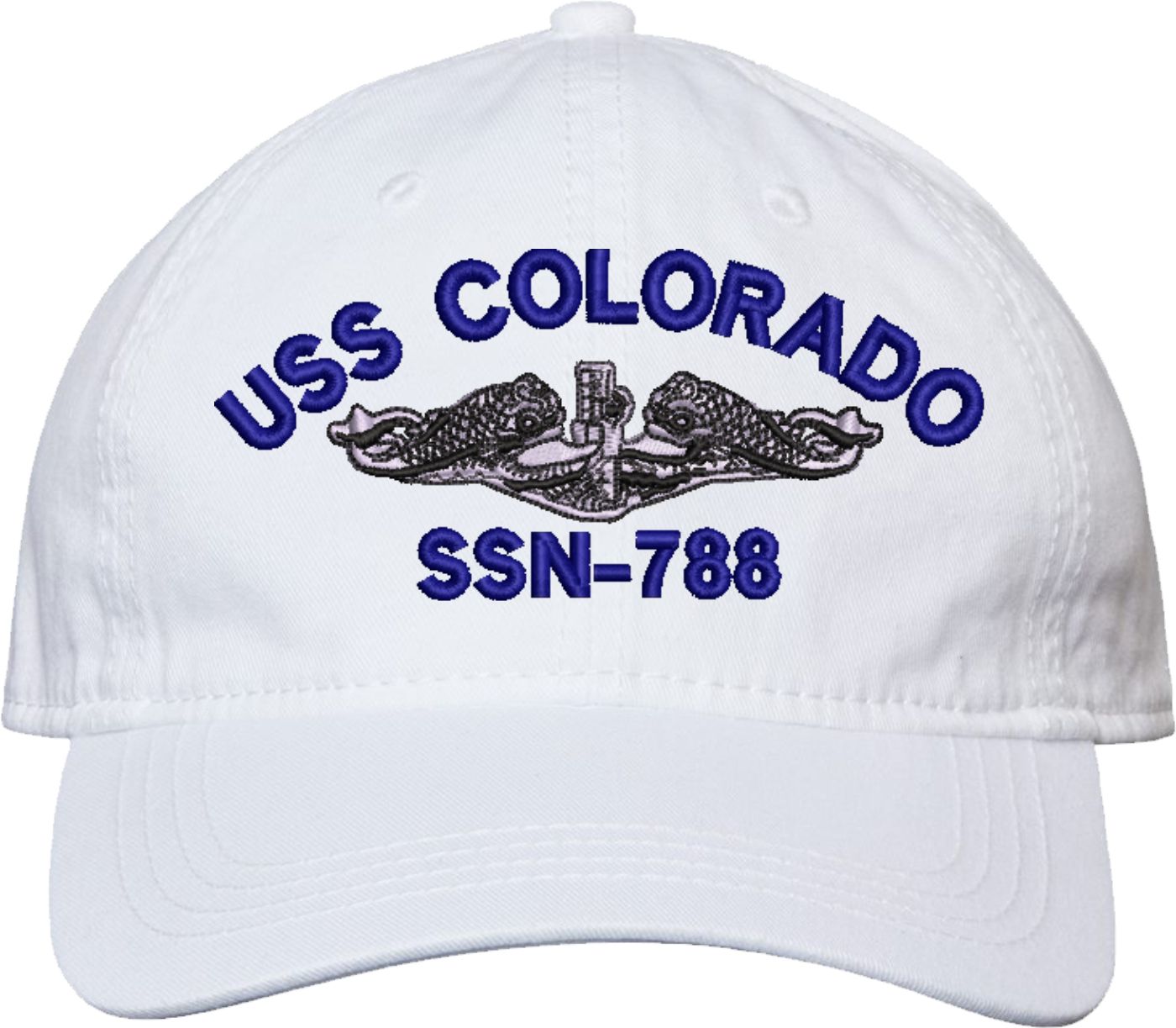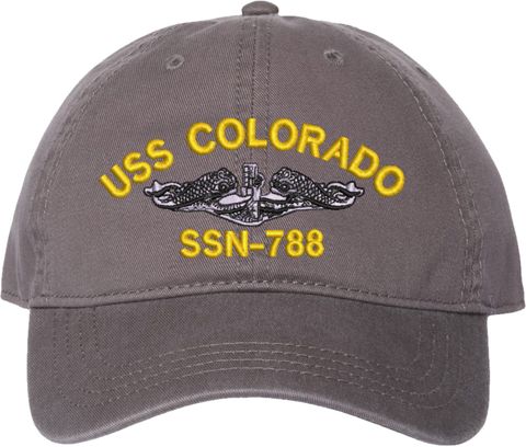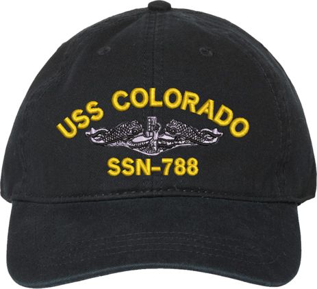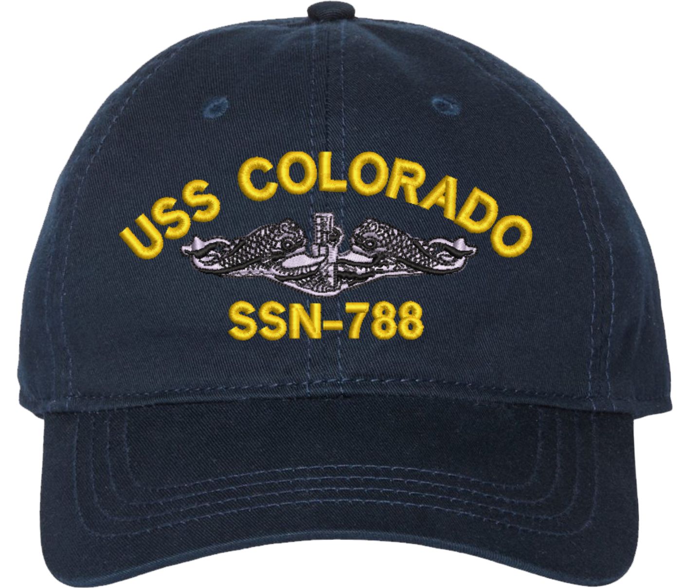 Show your Navy pride with this USS Colorado SSN-788 with Dolphins Unstructured Dad Cap from MilitaryBest. Crafted from 100% washed chino twill cotton, this six-panel, low-profile cap offers a relaxed and comfortable fit. Featuring high-quality embroidery done in our Scottsboro, Alabama facility, this cap is designed with a pre-curved visor and an adjustable tri-glide buckle closure for a perfect fit. Whether for everyday wear or as a meaningful gift, this cap is a great way to honor your own or a loved one's service.For caps ordered with custom embroidered personalized text please allow an additional 3 to 5 days production time. All custom back text will be embroidered in ALL CAPITAL LETTERS. Caps with back text or eggs are non-returnable unless there is a material defect in the cap.
