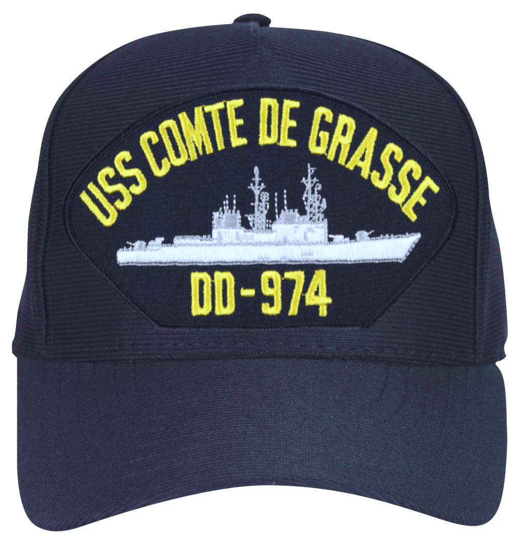 This USS Comte De Grasse DD-974 Ship Cap is an emblematic, poly, dark under the visor cap. Each has an adjustable strap, and is available as a 5 panel high profile or 6 panel low profile cap. All MilitaryBest caps are fully guaranteed. Some people call them Military Covers or Military Hats. This Military Cap is proudly Made in The U.S.A.For caps ordered with custom embroidered personalized text please allow an additional 3 to 5 days production time. All custom back text will be embroidered in ALL CAPITAL LETTERS. Caps with back text or eggs are non-returnable unless there is a material defect in the cap. If a style is not selected the cap will be made using a high profile style cap as pictured.