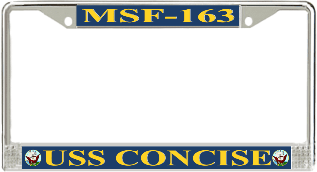 USS Concise MSF-163 License Plate FrameThis USS Concise MSF-163 License Plate Frame is proudly made in the USA at our facilities in Scottsboro, Alabama. Each of our MilitaryBest U.S. Navy Frames feature top and bottom Poly Coated Aluminum strips that are printed using sublimation which gives these quality automobile military frames a beautiful high gloss finish.