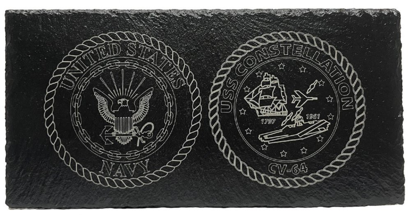 We are proud to offer this laser engraved slate plaque. This USS Constellation CV-64 Enlisted Plaque is engraved on a 12 x 6 inch piece of slate that offers a rustic and classic way to display on your desktop or book shelf. All plaques come with a black metal three leg stand. This plaque is Offically Licensed product by the Navy and made in the USA.