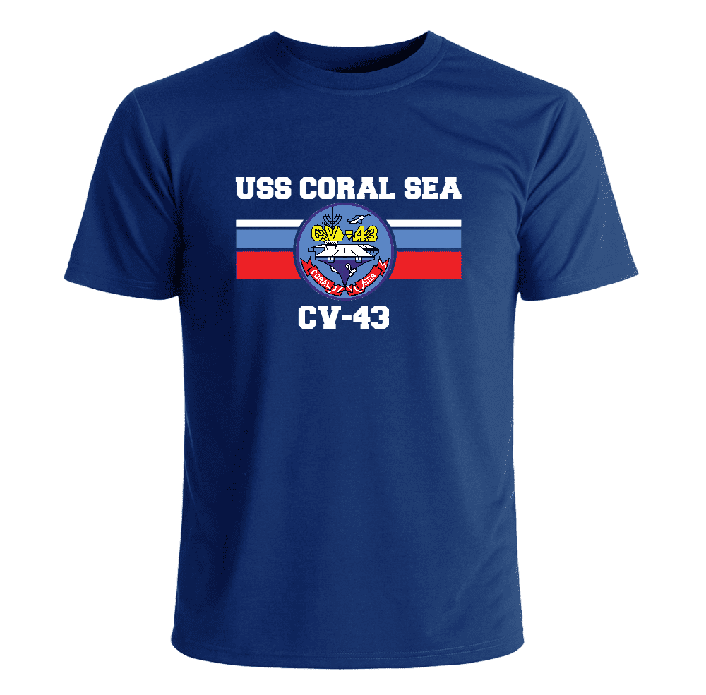 MilitaryBest is proud to offer this U.S. Navy Aircraft Carrier Crest T-Shirt. Each design is offered in Navy Blue. This fine USS Coral Sea CV-43 Crest T-Shirt is proudly printed in the USA. The quality of all of our Military products is guaranteed. Unless there is a defect in workmanship or material, these shirts are unreturnable. To all of our Vietnam Veterans WELCOME HOME!A percentage of the sale of each MilitaryBest item is forwarded to the licensing departments of each respective branch of service in support of the MWR (Morale, Welfare, & Recreation) program. These payments are made by either ALL4U LLC or the wholesaler from where the item originated. Our team thanks you for your service and your support of these programs.