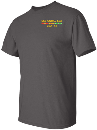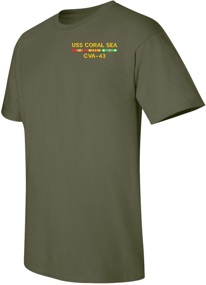 Note: Some of the Color Options pictured may not be available. Available Color Options are listed on the drop down menu above. Yellow colored text is embroidered in black on Khaki Tan and White shirts.MilitaryBest is proud to offer this USS Coral Sea CVA-43 with Vietnam Service Ribbons T-Shirt. These quality Military T-Shirts are proudly embroidered at our facilities in Scottsboro, AL. Support the Navy MWR program by purchasing only from Licensed Vendors. To all of our Vietnam Veterans, Welcome Home!