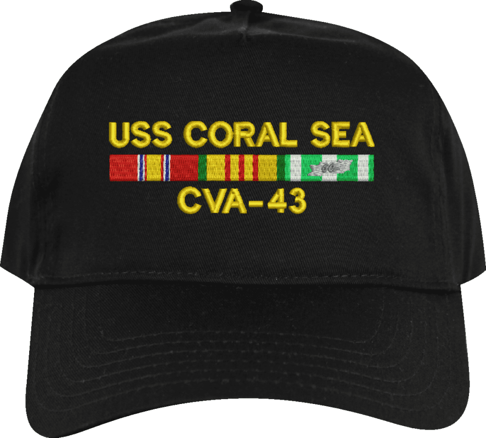MilitaryBest is proud to offer this USS Coral Sea CVA-43 with Vietnam Service Ribbons Embroidered Cap. This cap is available in a 5 panel high profile or 6 panel low profile styling. All our caps are made from top quality materials. This cap would make a wonderful addition to your collection or a great gift! All custom embroidery is done at our facility in Scottsboro, AL. *Caps ordered with embroidered back text requires an additional 1 to 2 days of production time. All personalized caps will be embroidered in ALL CAPITAL LETTERS. Caps personalized with back text are not returnable unless there is a material defect in the cap.A percentage of the sale of each MilitaryBest item is forwarded to the licensing departments of each respective branch of service in support of the MWR (Morale, Welfare, & Recreation) program. These payments are made by either ALL4U LLC or the wholesaler from where the item originated. Our team thanks you for your service and your support of these programs.