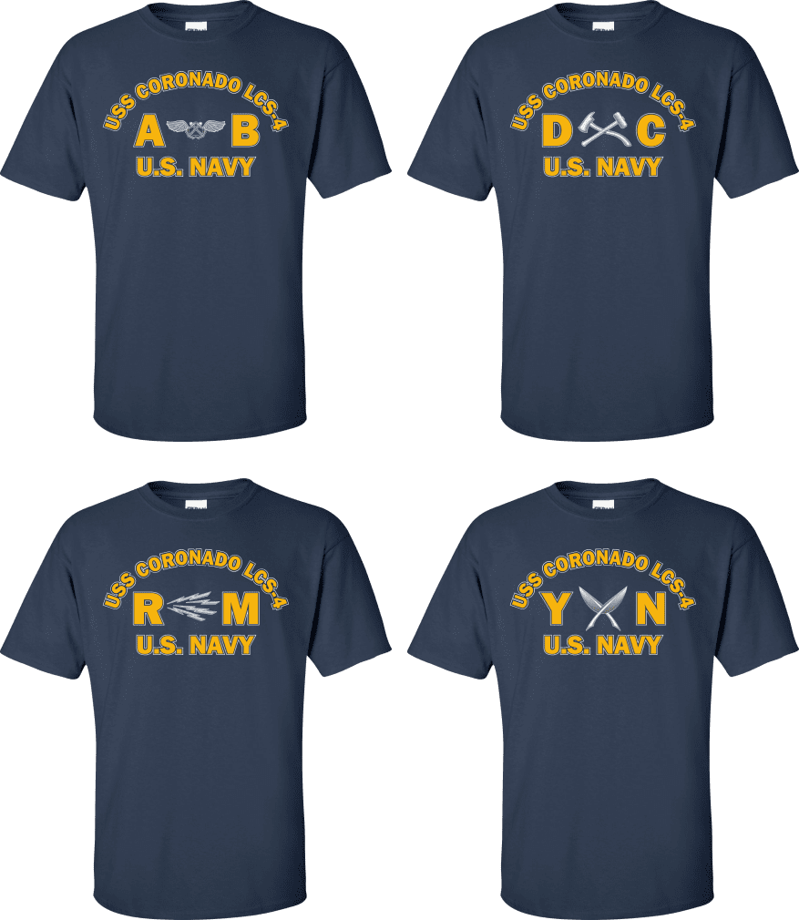 Due to disruptions in supply chains, this design will be embroidered on a Champion, Gildan, Jerzees or comparable brand.Proudly display your ship and rate with our top quality USS CORONADO LCS-4 Rates t-shirts, sweatshirts, and hoodies. These fine U.S. Navy apparel items will make you the envy of your veteran buddies, or will make a fine gift! Our USS CORONADO LCS-4 shirts are proudly printed in the USA!