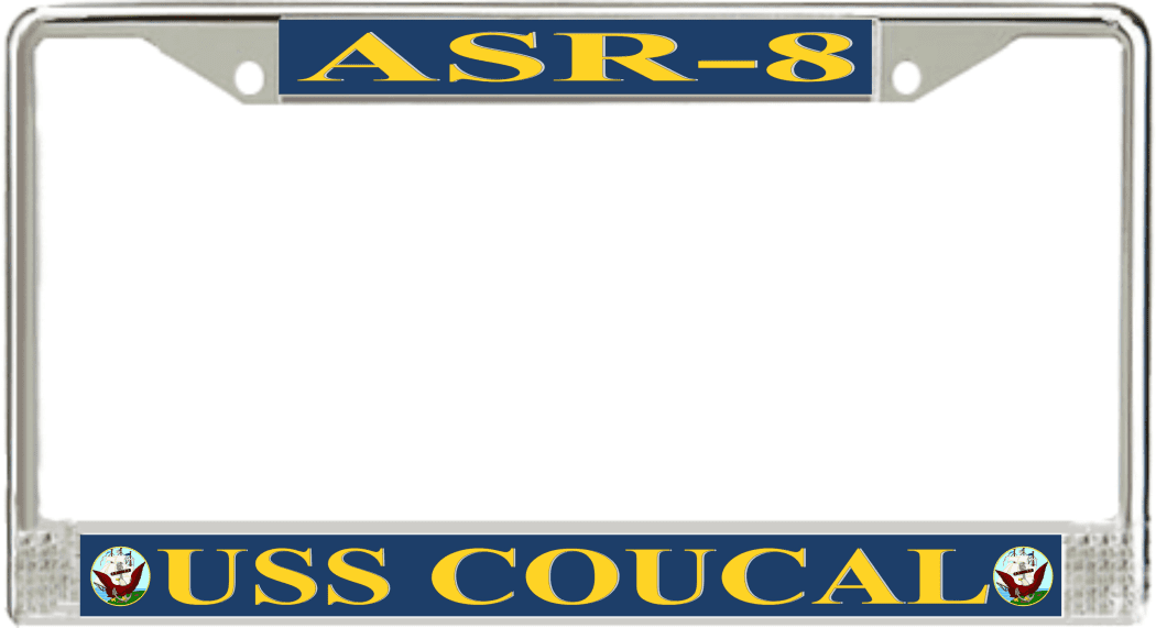 USS Coucal ASR-8 License Plate FrameThis USS Coucal ASR-8 License Plate Frame is proudly made in the USA at our facilities in Scottsboro, Alabama. Each of our MilitaryBest U.S. Navy Frames feature top and bottom Poly Coated Aluminum strips that are printed using sublimation which gives these quality automobile military frames a beautiful high gloss finish.