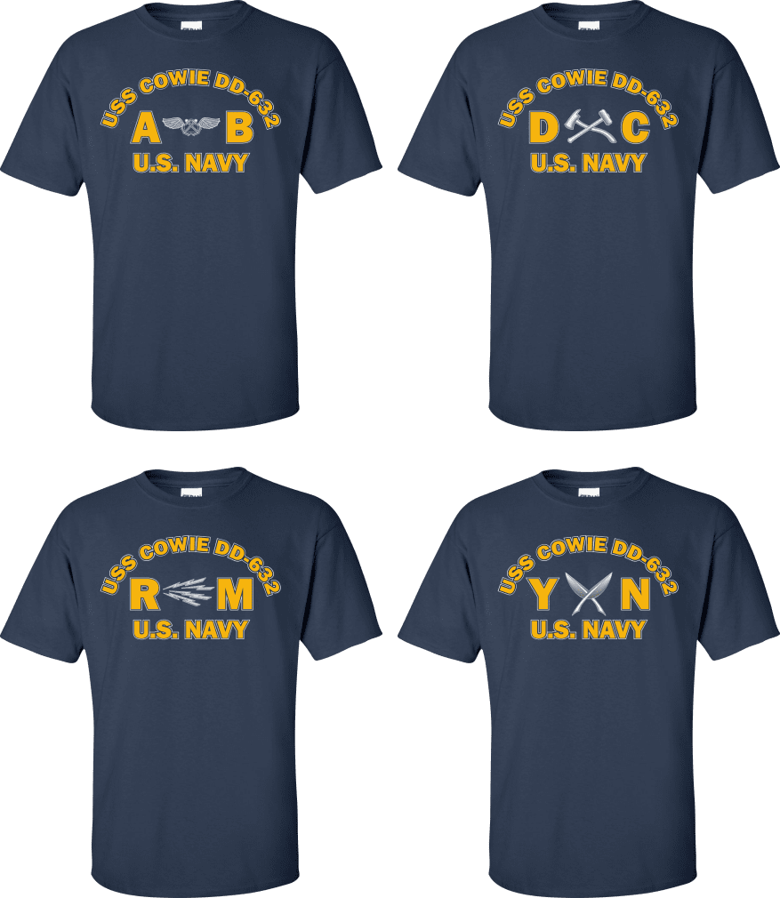 Due to disruptions in supply chains, this design will be embroidered on a Champion, Gildan, Jerzees or comparable brand.Proudly display your ship and rate with our top quality USS COWIE DD-632 Rates t-shirts, sweatshirts, and hoodies. These fine U.S. Navy apparel items will make you the envy of your veteran buddies, or will make a fine gift! Our USS COWIE DD-632 shirts are proudly printed in the USA!