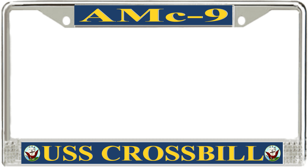 USS Crossbill AMc-9 License Plate FrameThis USS Crossbill AMc-9 License Plate Frame is proudly made in the USA at our facilities in Scottsboro, Alabama. Each of our MilitaryBest U.S. Navy Frames feature top and bottom Poly Coated Aluminum strips that are printed using sublimation which gives these quality automobile military frames a beautiful high gloss finish.