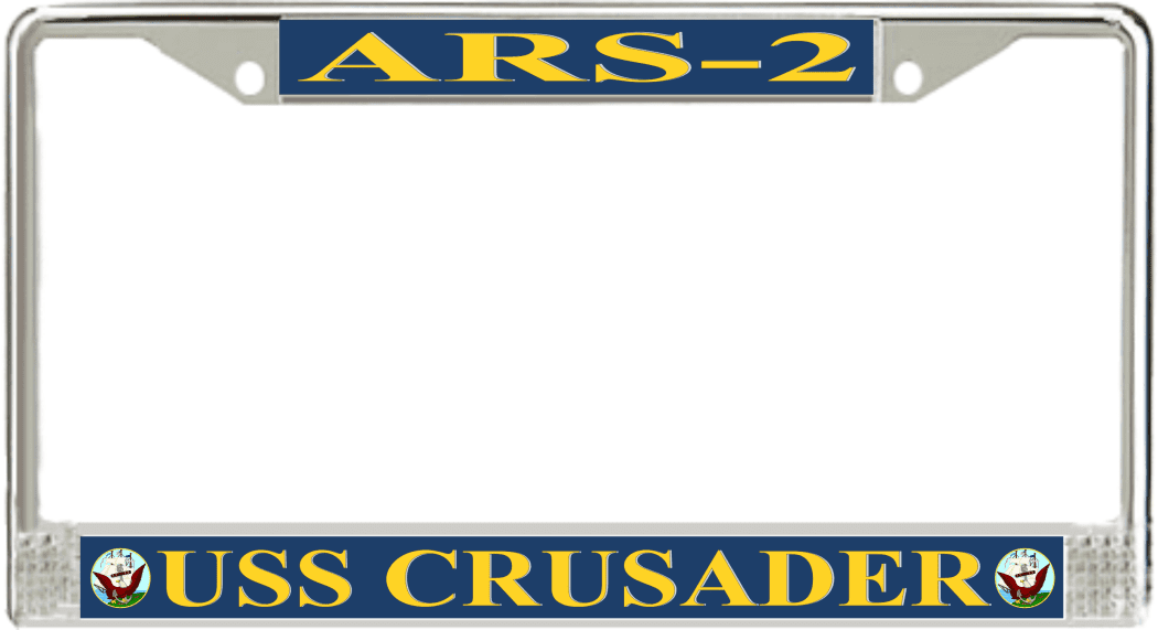 USS Crusader ARS-2 License Plate FrameThis USS Crusader ARS-2 License Plate Frame is proudly made in the USA at our facilities in Scottsboro, Alabama. Each of our MilitaryBest U.S. Navy Frames feature top and bottom Poly Coated Aluminum strips that are printed using sublimation which gives these quality automobile military frames a beautiful high gloss finish.