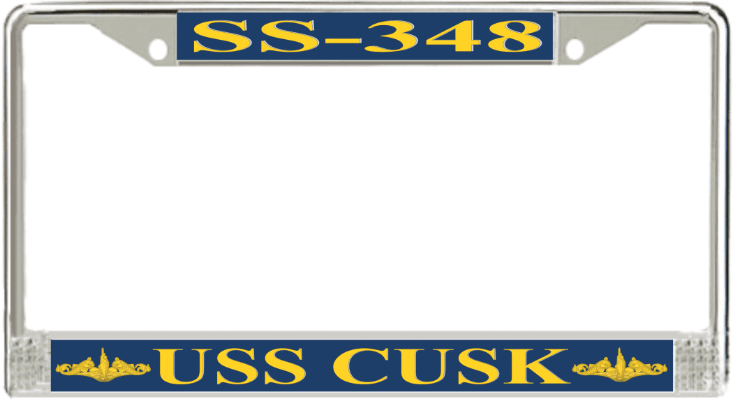 USS Cusk SS-348 License Plate Frame This USS Cusk SS-348 License Plate Frame is proudly made in the USA at our facilities in Scottsboro, Alabama. Each Frame features top and bottom sublimated design strips that are poly coated for a protective gloss finish. Please check your state and local regulations for compatibility of these frames for use on your vehicle.
