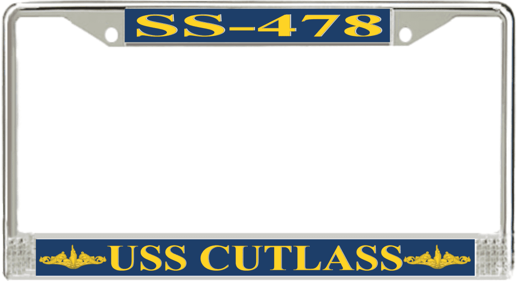 USS Cutlass SS-478 License Plate Frame This USS Cutlass SS-478 License Plate Frame is proudly made in the USA at our facilities in Scottsboro, Alabama. Each Frame features top and bottom sublimated design strips that are poly coated for a protective gloss finish. Please check your state and local regulations for compatibility of these frames for use on your vehicle.