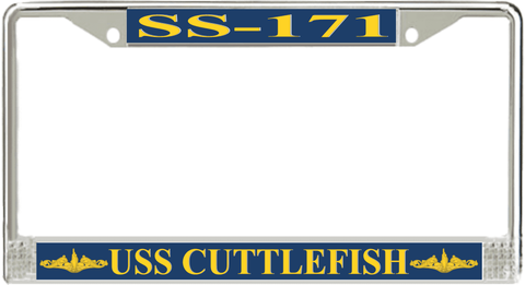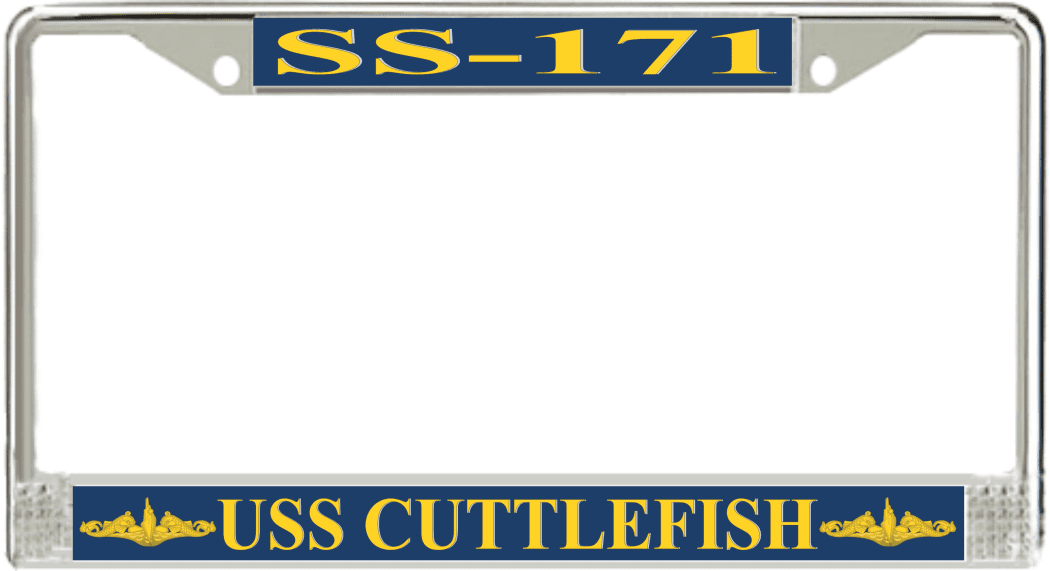 USS Cuttlefish SS-171 License Plate Frame This USS Cuttlefish SS-171 License Plate Frame is proudly made in the USA at our facilities in Scottsboro, Alabama. Each Frame features top and bottom sublimated design strips that are poly coated for a protective gloss finish. Please check your state and local regulations for compatibility of these frames for use on your vehicle.