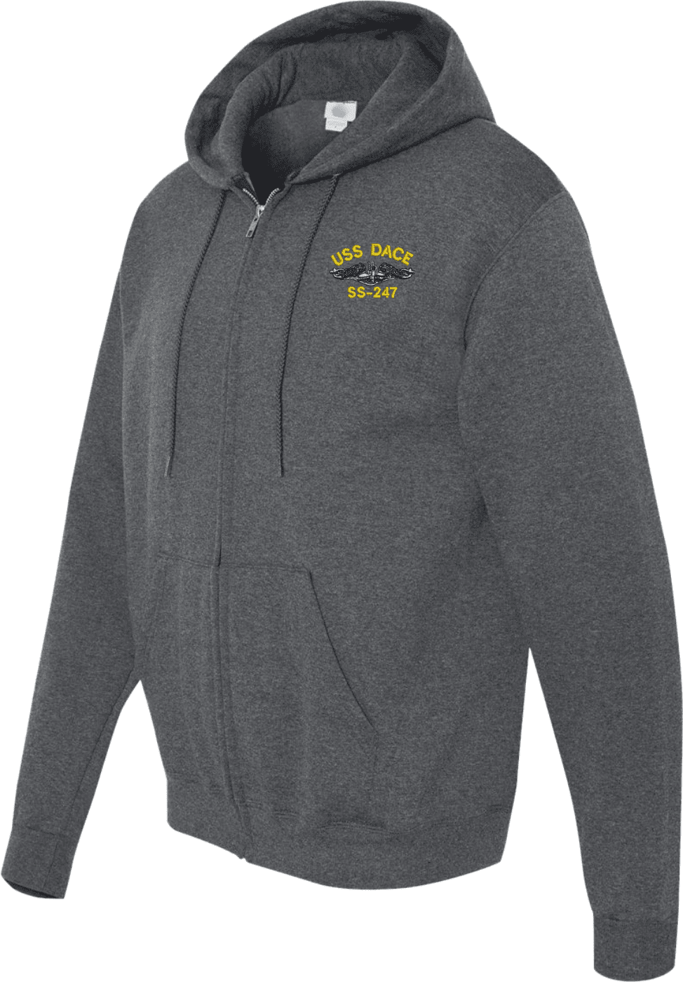 MilitaryBest has expanded its line of apparel with this custom embroidered USS Dace SS-221 with Dolphins Embroidered Zippered Hoodie. Each Hoodie is direct embroidered onto a Champion brand 9.5 oz 50/50 Cotton Poly blend. This will make an excellent addition to your wardrobe, or a great gift. Your satisfaction is Guaranteed! These quality zippered hoodies are proudly embroidered at our facilities in Scottsboro, AL. Support the Army MWR program by purchasing only from Licensed Vendors.