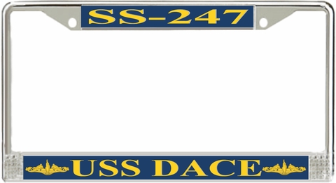 USS Dace SS-247 License Plate Frame This USS Dace SS-247 License Plate Frame is proudly made in the USA at our facilities in Scottsboro, Alabama. Each Frame features top and bottom sublimated design strips that are poly coated for a protective gloss finish. Please check your state and local regulations for compatibility of these frames for use on your vehicle.