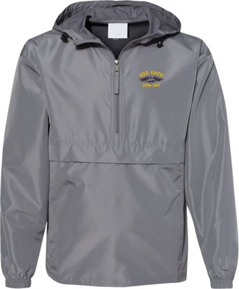 MilitaryBest is proud to offer this quality USS Dace SSN-607 with Dolphins Hooded Windbreaker. Also known as an Anorak Jacket, this windbreaker is designed to keep wind and water out. With a design embroidered over the left chest, this windbreaker is embroidered to order at our facilities in Scottsboro, AL.. This windbreaker can be packed into the mesh lined pouch pocket for a more portable method of storage.- 100% Polyester
