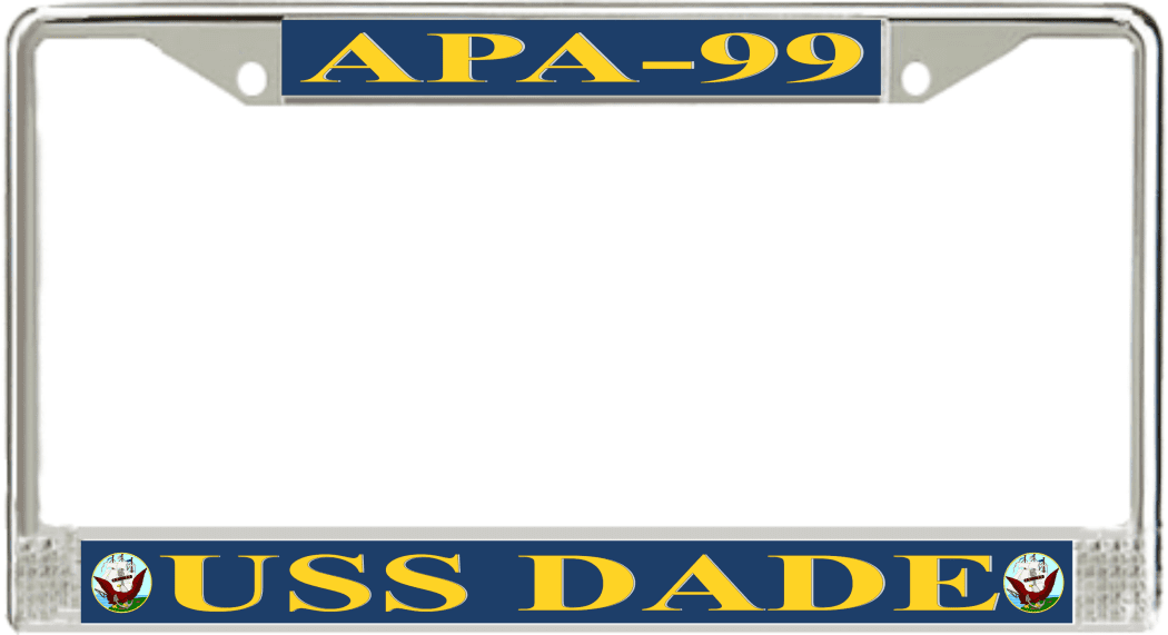 USS Dade APA-99 License Plate FrameThis USS Dade APA-99 License Plate Frame is proudly made in the USA at our facilities in Scottsboro, Alabama. Each of our MilitaryBest U.S. Navy Frames feature top and bottom Poly Coated Aluminum strips that are printed using sublimation which gives these quality automobile military frames a beautiful high gloss finish.