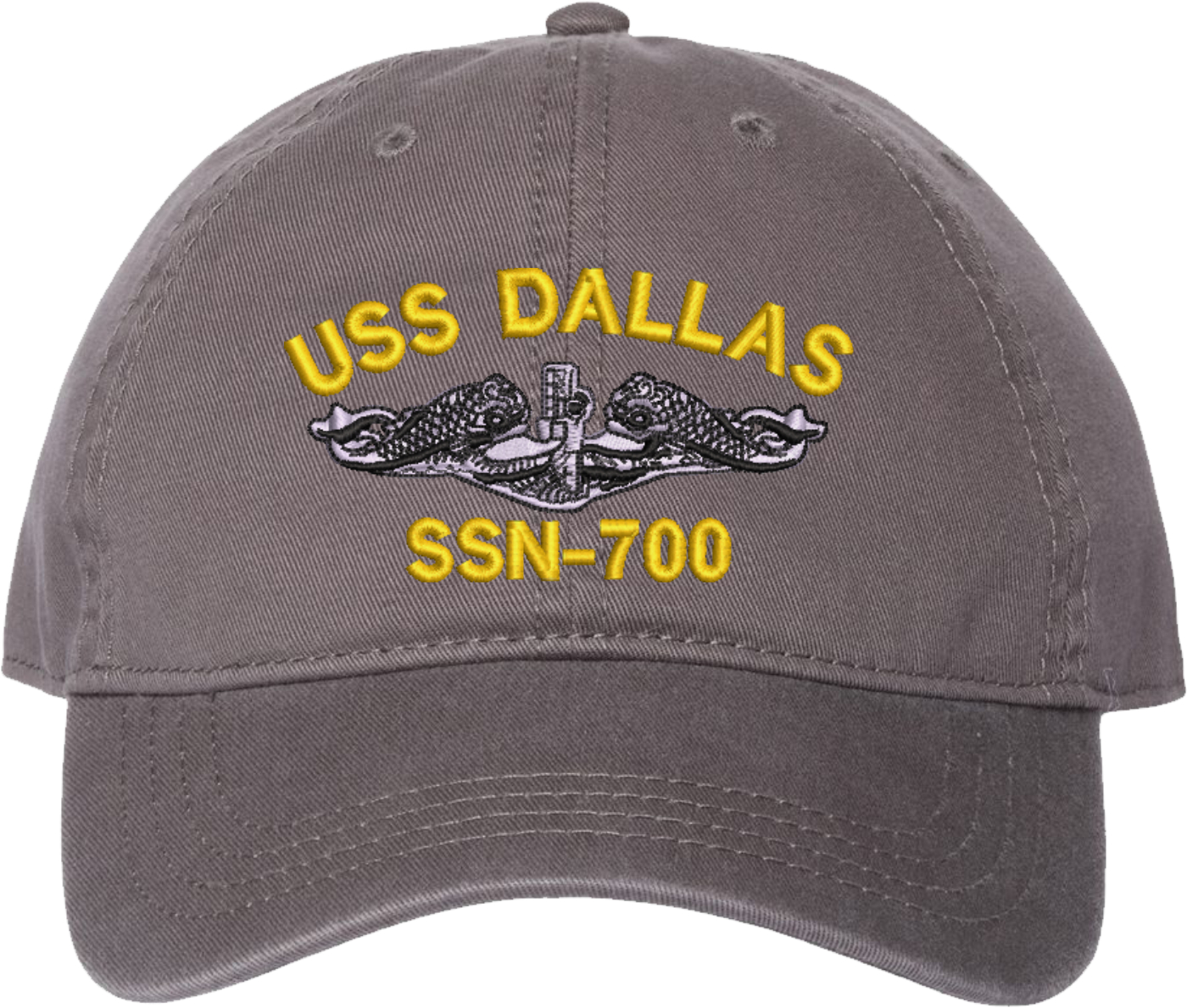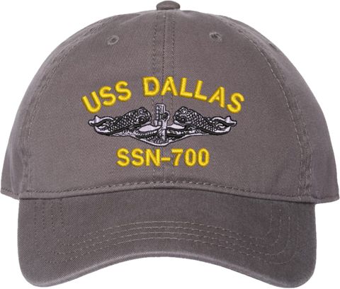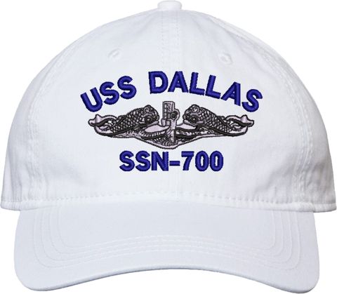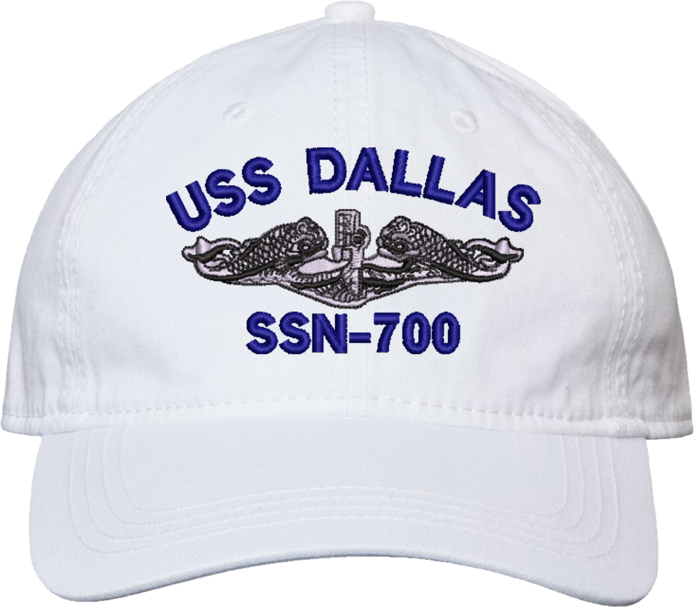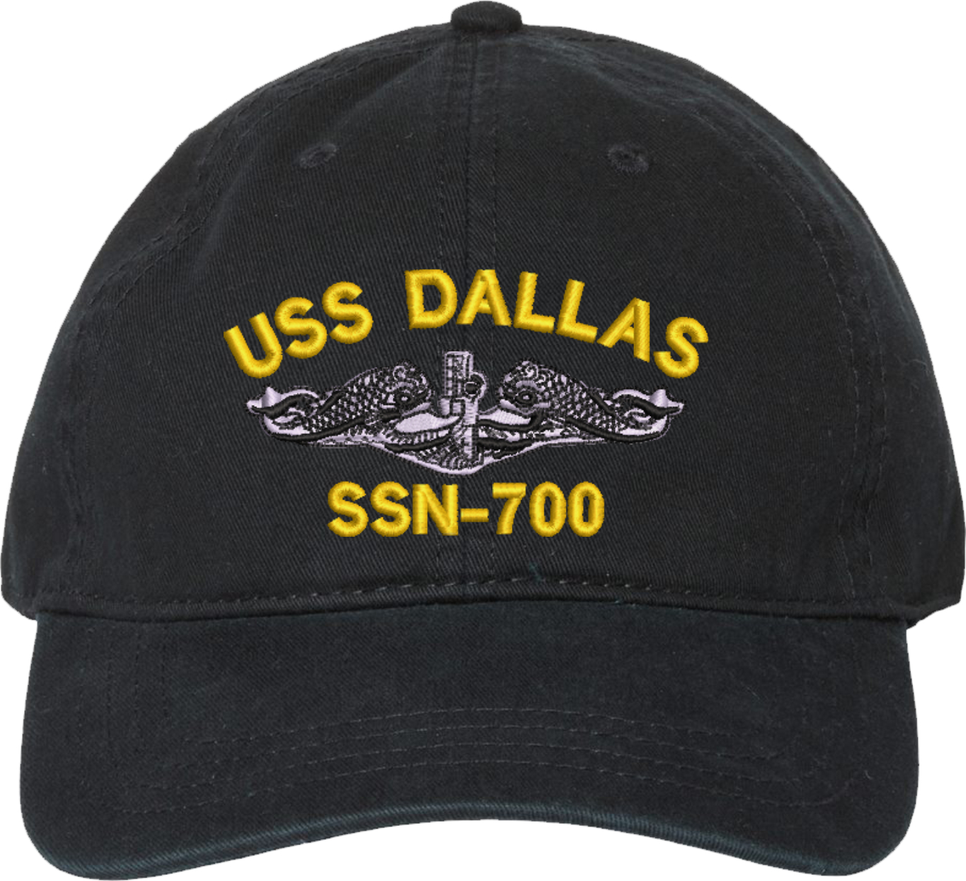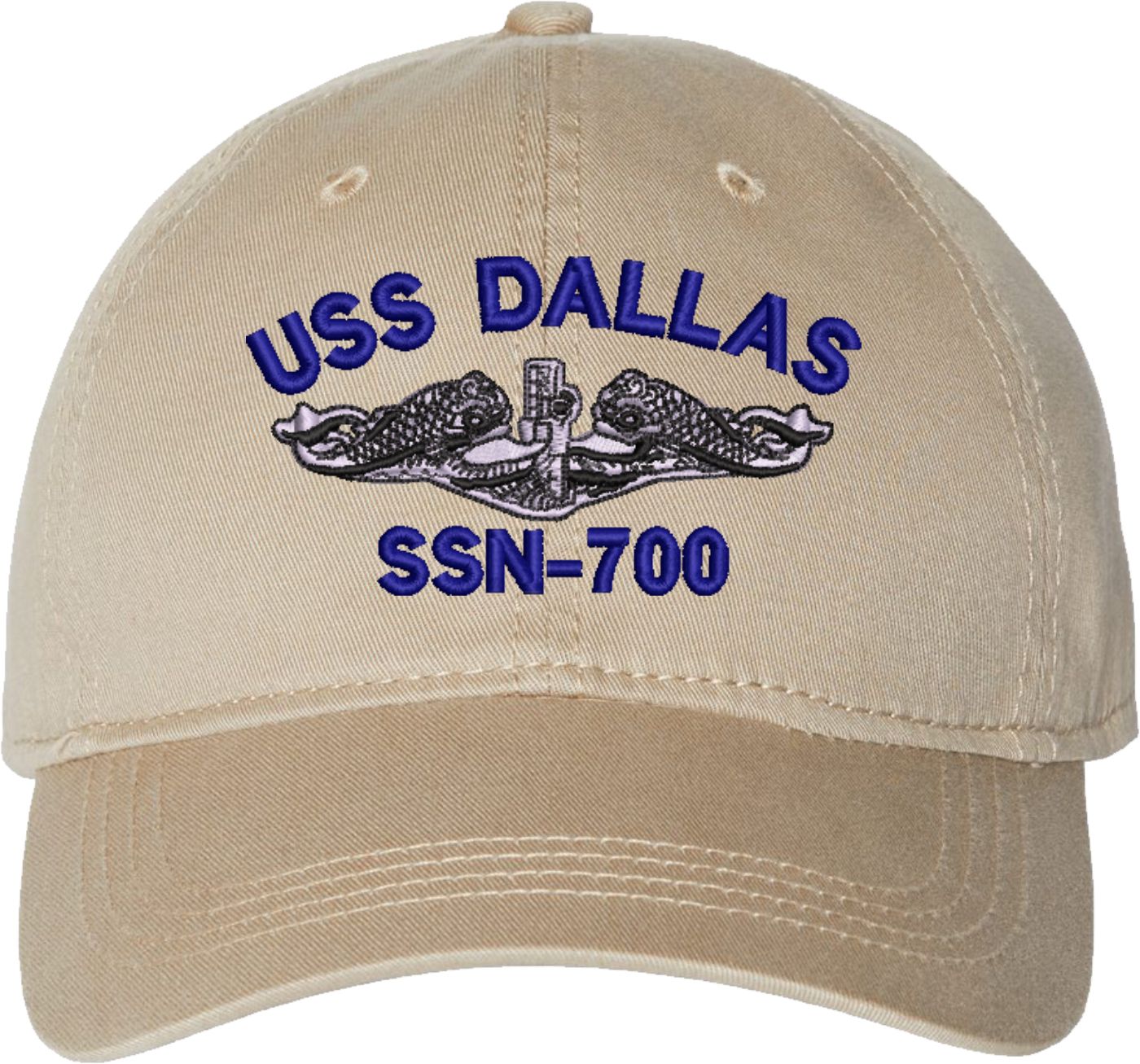 Show your Navy pride with this USS Dallas SSN-700 with Dolphins Unstructured Dad Cap from MilitaryBest. Crafted from 100% washed chino twill cotton, this six-panel, low-profile cap offers a relaxed and comfortable fit. Featuring high-quality embroidery done in our Scottsboro, Alabama facility, this cap is designed with a pre-curved visor and an adjustable tri-glide buckle closure for a perfect fit. Whether for everyday wear or as a meaningful gift, this cap is a great way to honor your own or a loved one's service.For caps ordered with custom embroidered personalized text please allow an additional 3 to 5 days production time. All custom back text will be embroidered in ALL CAPITAL LETTERS. Caps with back text or eggs are non-returnable unless there is a material defect in the cap.