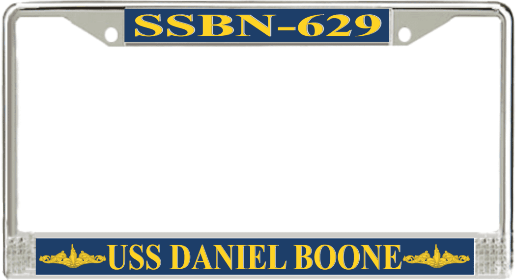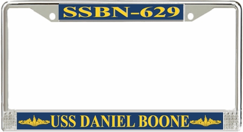 USS Daniel Boone SSBN-629 License Plate Frame This USS Daniel Boone SSBN-629 License Plate Frame is proudly made in the USA at our facilities in Scottsboro, Alabama. Each Frame features top and bottom sublimated design strips that are poly coated for a protective gloss finish. Please check your state and local regulations for compatibility of these frames for use on your vehicle.