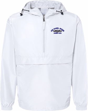 MilitaryBest is proud to offer this quality USS Daniel Boone SSBN-629 with Dolphins Hooded Windbreaker. Also known as an Anorak Jacket, this windbreaker is designed to keep wind and water out. With a design embroidered over the left chest, this windbreaker is embroidered to order at our facilities in Scottsboro, AL.. This windbreaker can be packed into the mesh lined pouch pocket for a more portable method of storage.- 100% Polyester